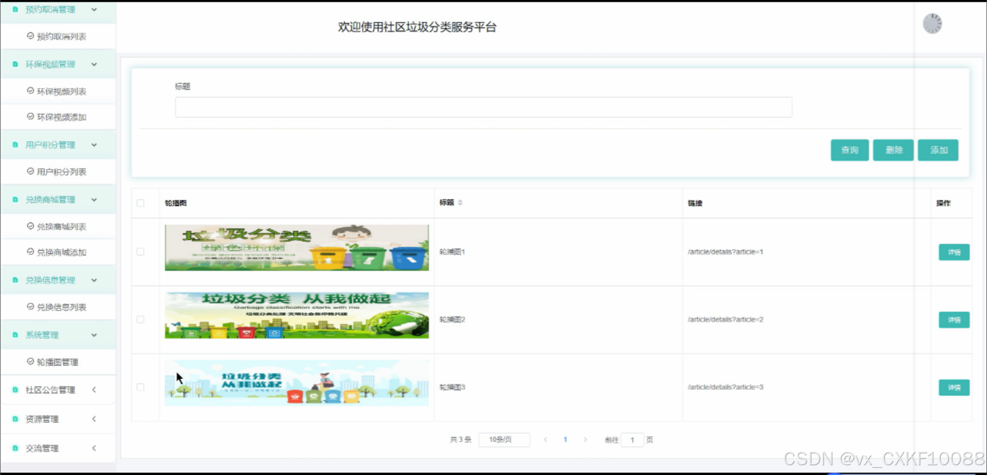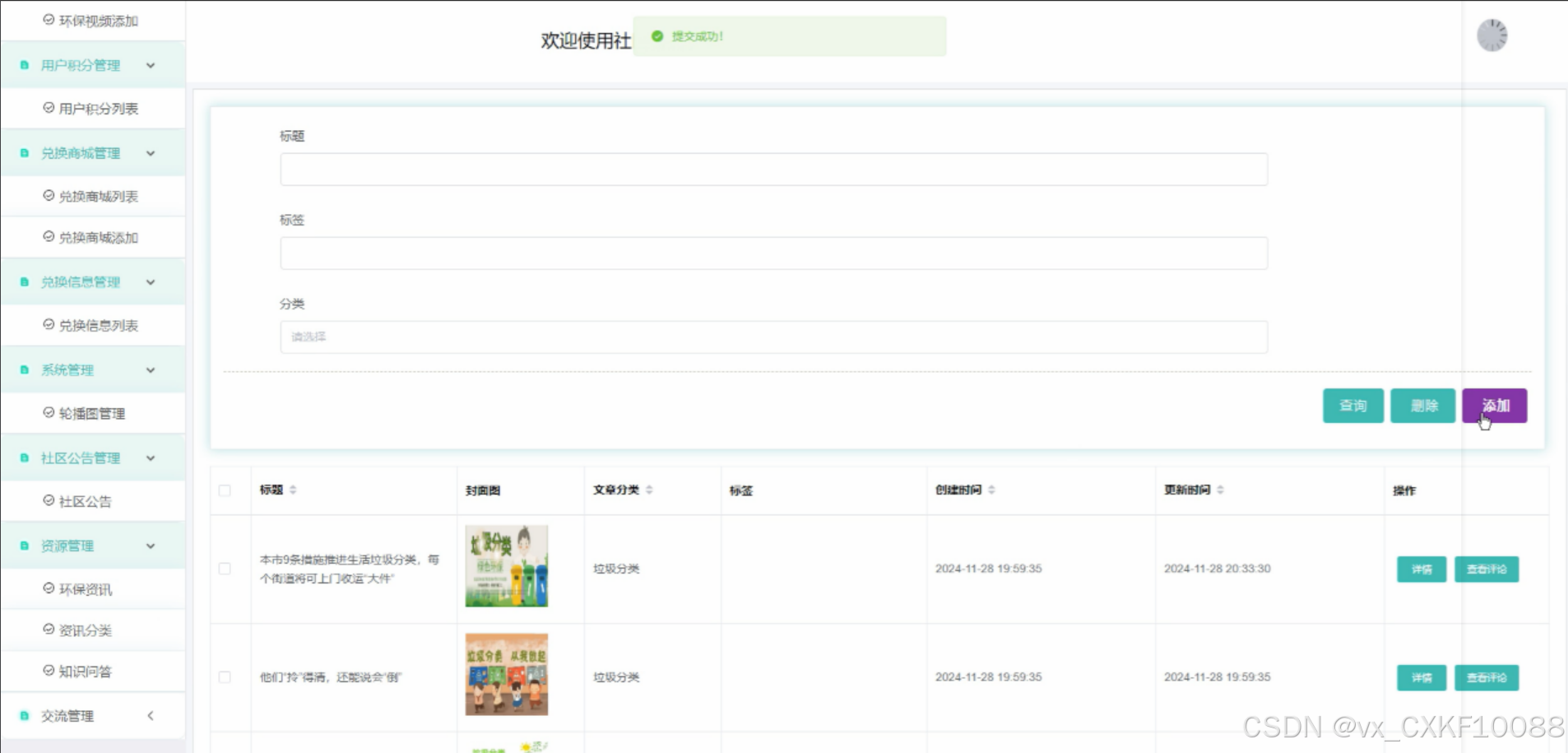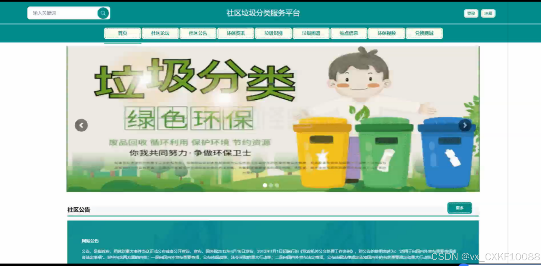 This platform integrates various user role permission management, garbage type and recycling classification management, appointment and order information management, environmental video education, user points and redemption mall, information management and community communication and other functional modules. These functional modules aim to improve the efficiency of community garbage classification, popularize environmental knowledge, enhance residents' environmental awareness, and jointly promote the sustainable development of community garbage classification. Through this platform, we hope to provide a new solution for community garbage classification management and contribute to the cause of environmental protection.