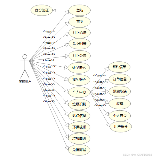 (3)功能模块开发与实现:我们开发了多个功能模块,包括用户管理模块、垃圾种类与回收分类管理模块、预约与订单信息管理模块、环保视频教育模块以及用户积分与兑换商城模块等。这些模块不仅满足了不同用户角色的需求,还提供了丰富的功能和便捷的操作体验,使得用户能够轻松地进行垃圾分类查询、预约回收、学习环保知识以及参与积分兑换等活动。