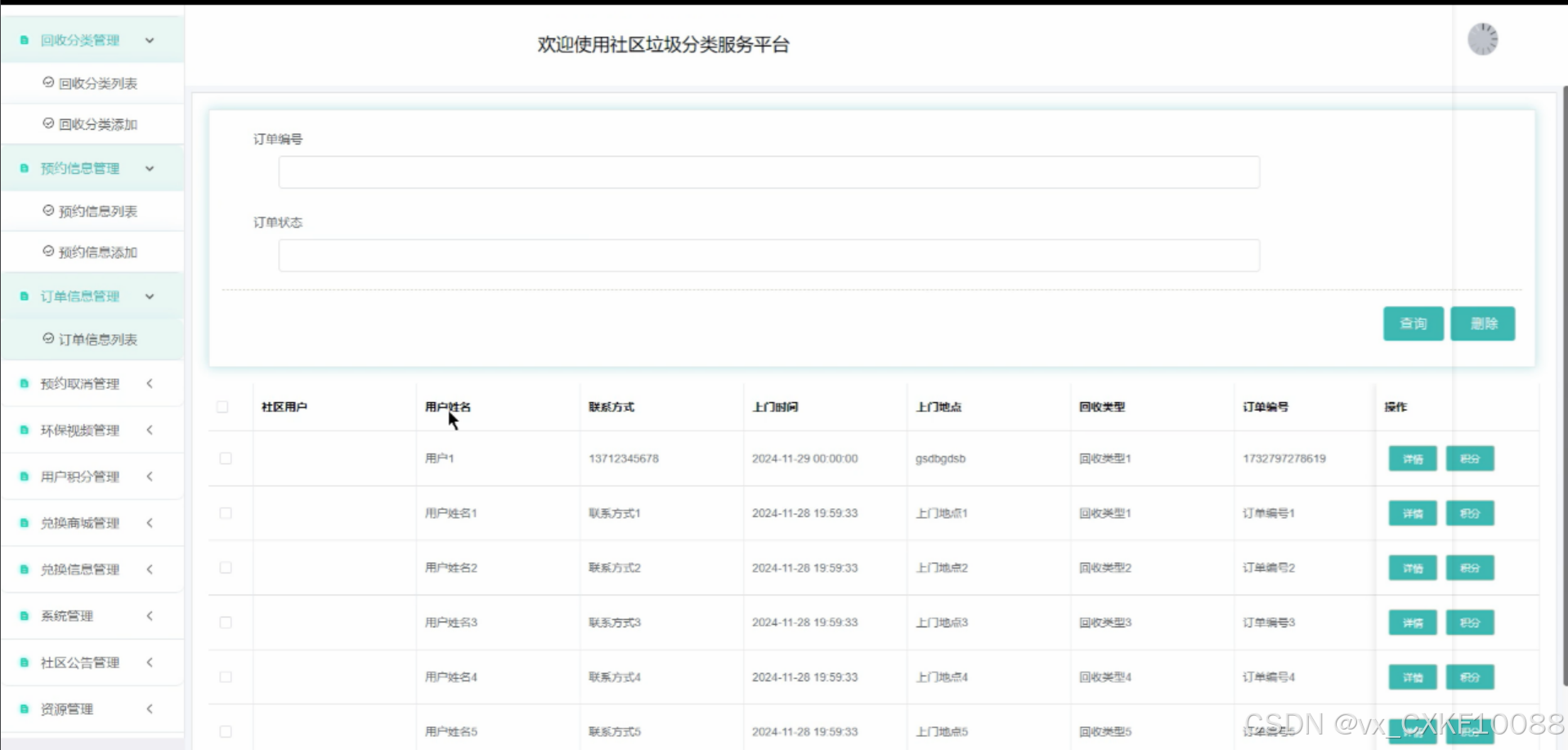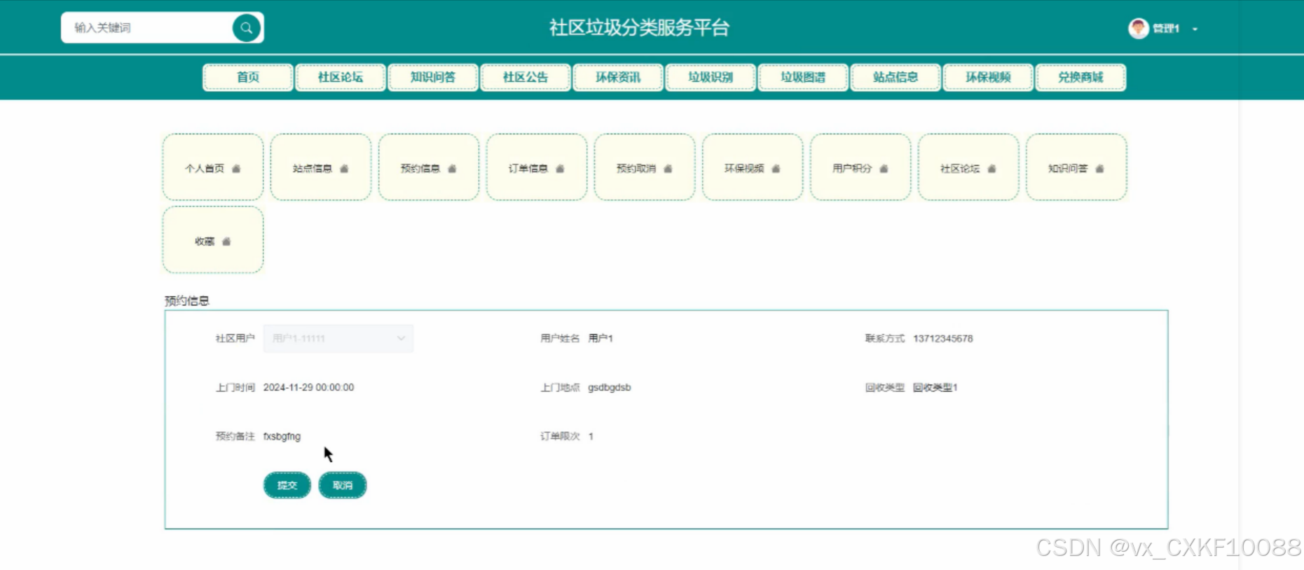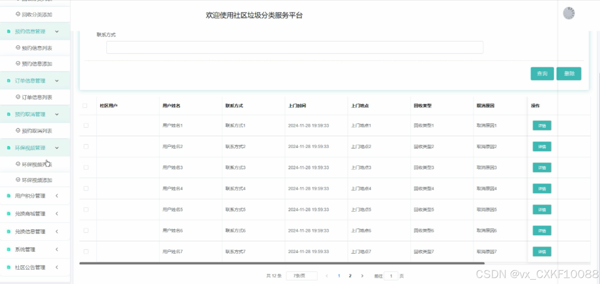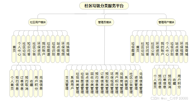 该平台集成了多种用户角色权限管理、垃圾种类与回收分类管理、预约与订单信息管理、环保视频教育、用户积分与兑换商城、资讯管理与社区交流等功能模块。这些功能模块旨在提升社区垃圾分类的效率,普及环保知识,增强居民的环保意识,从而共同推动社区垃圾分类事业的可持续发展。通过这款平台,我们希望能够为社区垃圾分类管理提供一种全新的解决方案,为环保事业贡献一份力量。