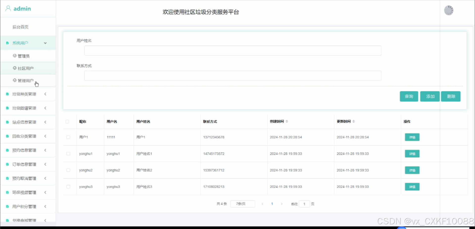 系统用户管理:对管理员、社区用户和管理用户进行增删改查操作,确保用户信息的准确性和安全性。