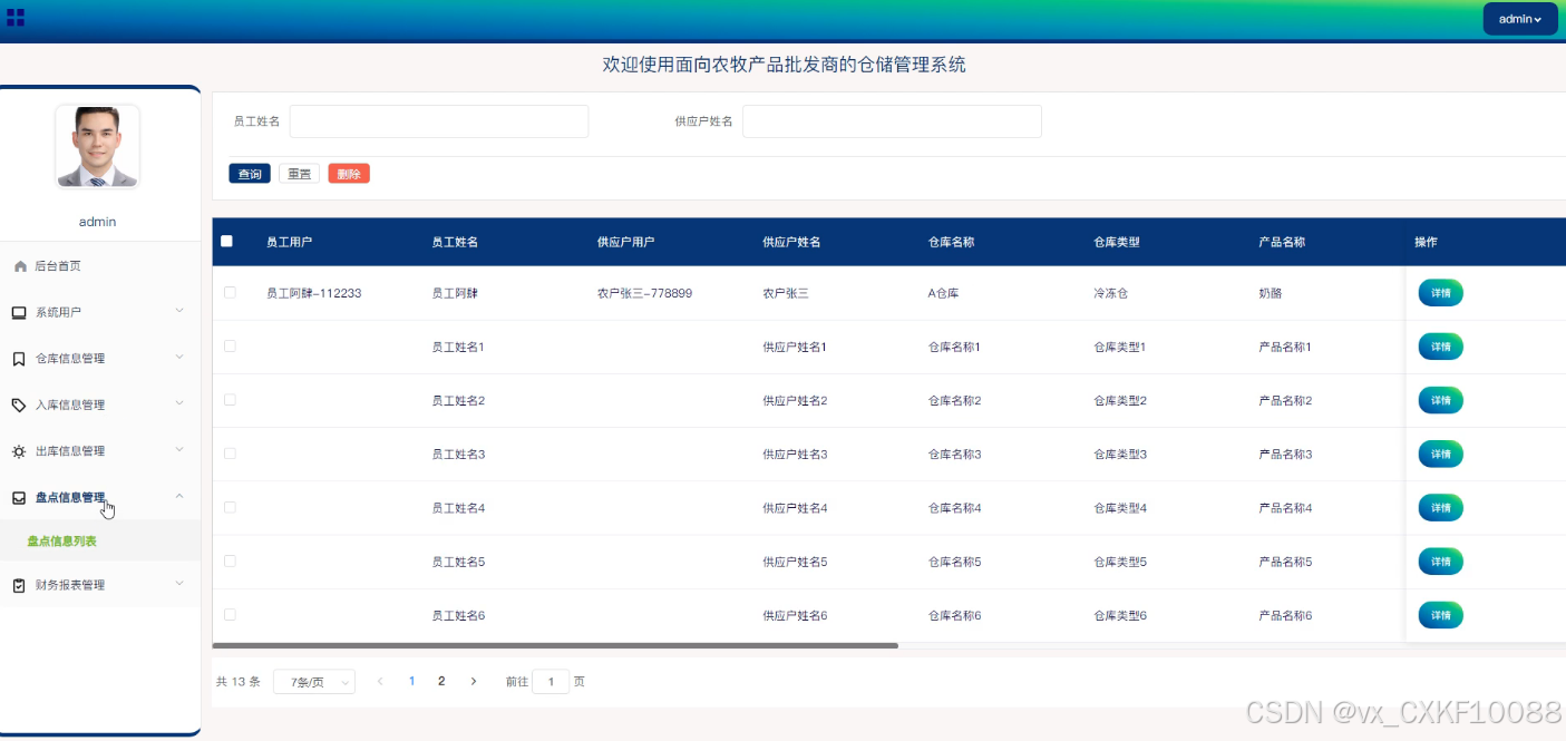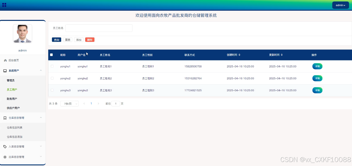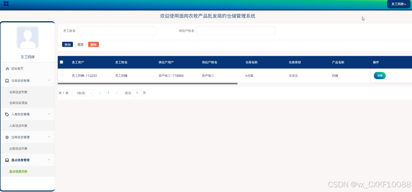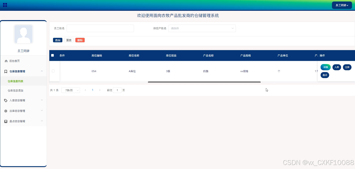 - 仓库信息管理:员工用户可以在此模块中进行仓库信息的添加、删除和查询操作。同时,员工还可以查看仓库的详细信息,以及进行入库、出库和盘点的相关操作,这些功能确保了仓库信息的实时更新和准确管理。