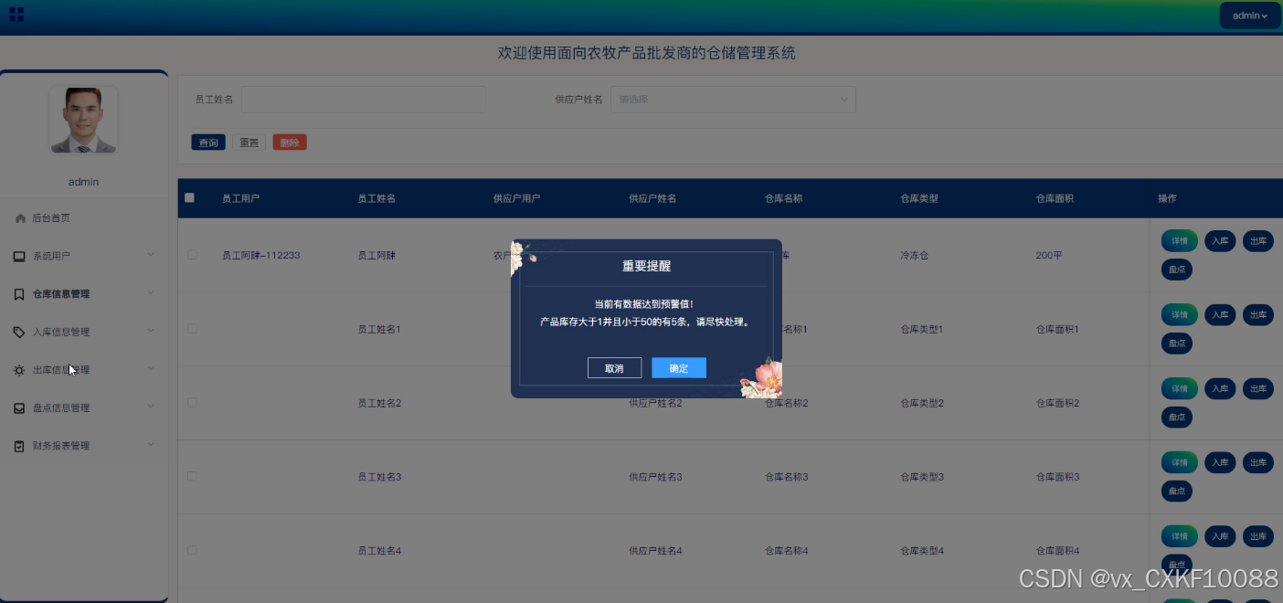 - 仓库信息管理:管理员可以对仓库信息进行添加、删除和查询操作,并且可以查看每个仓库的详细信息。此外,管理员还可以进行预警设置、管理入库和出库流程,以及执行盘点操作。