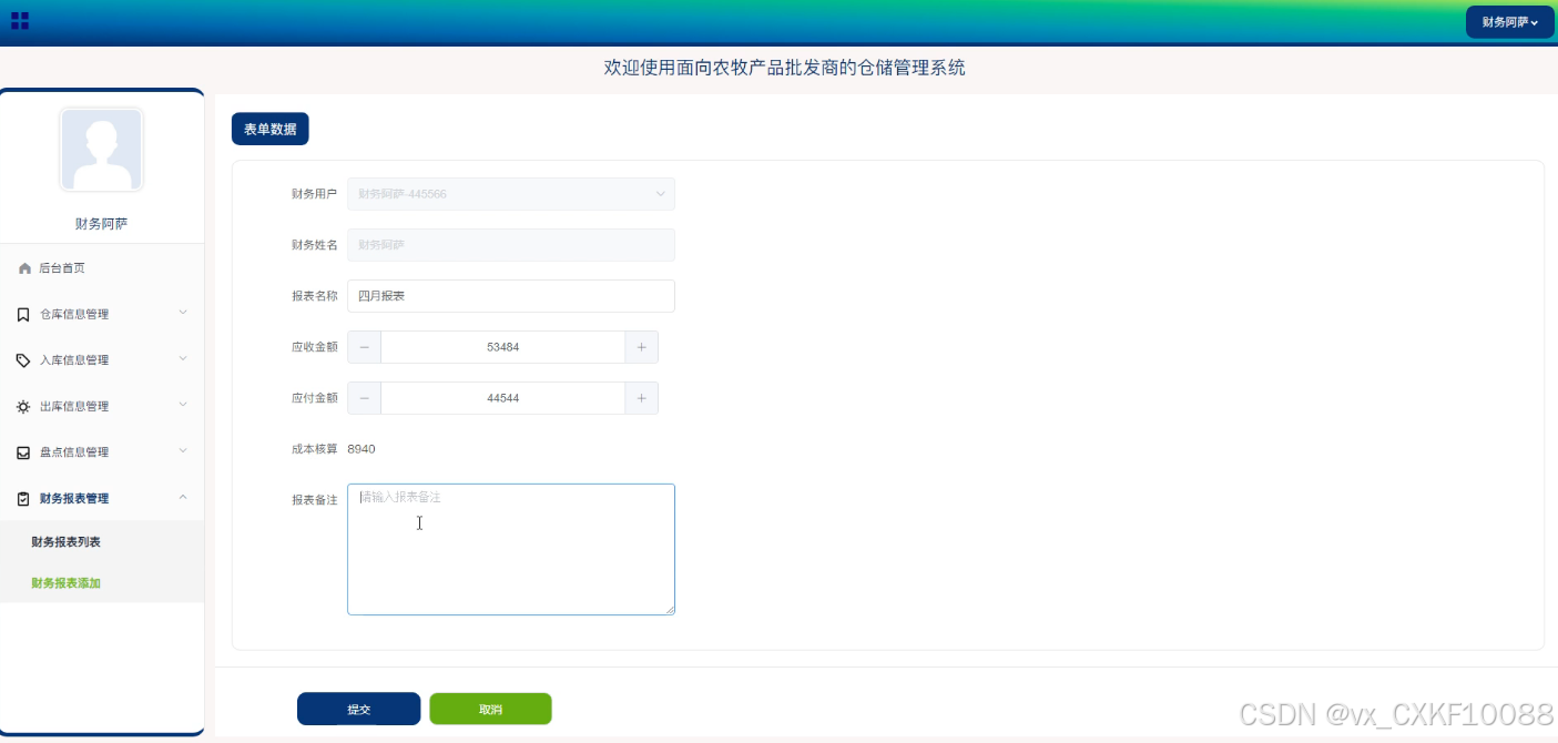 - 财务报表管理:用户可以进行添加、删除和查询操作,以管理财务报表。系统允许用户查看报表的详细内容,包括但不限于收入、支出、利润等关键财务指标,帮助用户做出明智的财务决策。