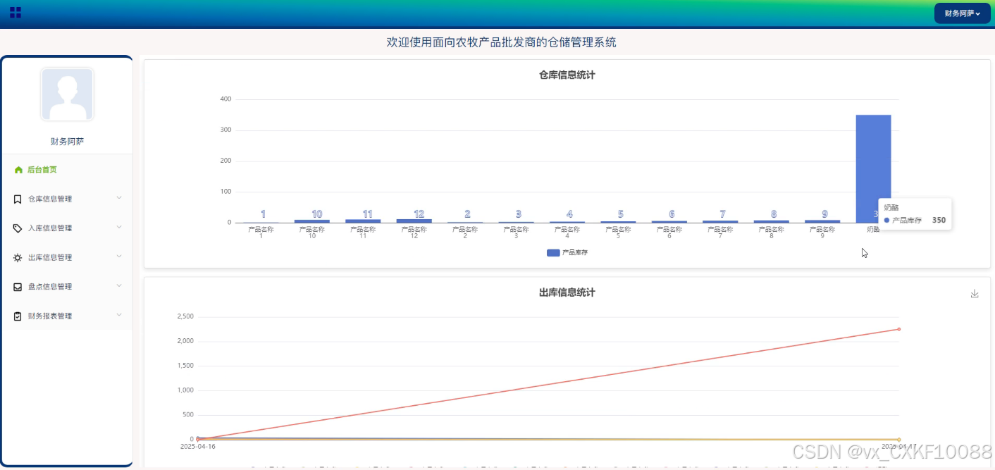 - 后台首页:在后台首页,管理员可以查看到仓库信息统计、出库信息统计以及财务报表统计等关键数据。此外,首页还包含功能栏,通过功能栏,管理员可以方便地进行账户信息的查看或修改,包括个人信息和密码的更新。