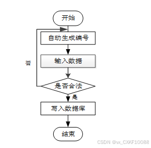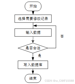 用户首先选择需要修改的记录,输入修改后的数据,系统判断输入数据是否合法。若数据不合法,提示重新输入,若数据合法,则将修改后的数据写入数据库,完成操作后流程结束。修改信息流程图如下图所示。