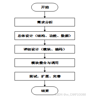 系统开发流程的主要步骤,从需求分析到系统完成的全过程。流程包括需求分析、总体设计(结构、功能、数据)、详细设计(模块、编码)、模块整合与调用,以及测试、扩展和完善,最终完成系统的开发。开发流程如下图所示