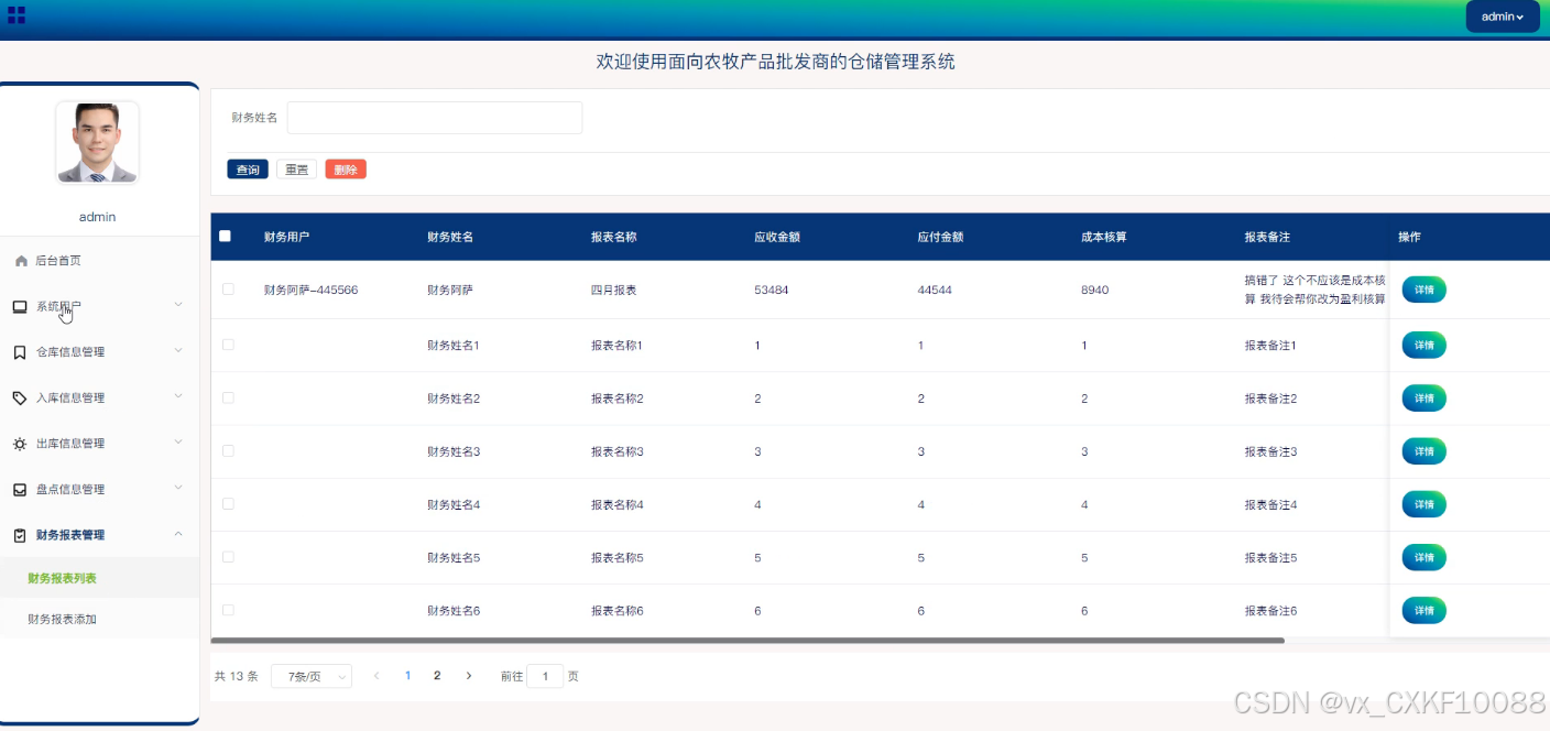 - 财务报表管理:管理员可以对财务报表进行添加、删除和查询操作,并且可以查看每个报表的详细信息,以便进行财务分析和决策。