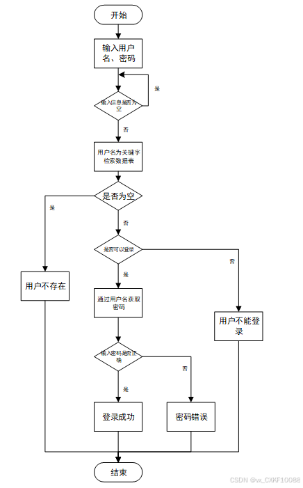 用户输入用户名和密码后,系统先检查输入是否为空,再验证用户名是否存在,若存在则通过用户名获取密码并校验。若密码正确则登录成功,否则提示密码错误。若用户名不存在或无法登录,提示用户操作无效。如下图所示。
