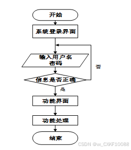 用户首先进入系统登录界面,输入用户名和密码后,系统验证信息是否正确。若验证失败,返回登录界面重新输入,若验证成功,则进入功能界面,执行相应功能处理后结束操作流程。操作流程如下图所示。