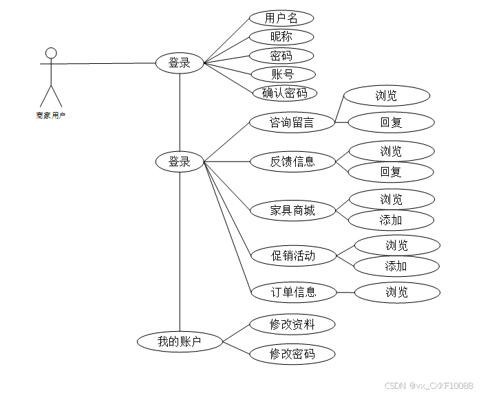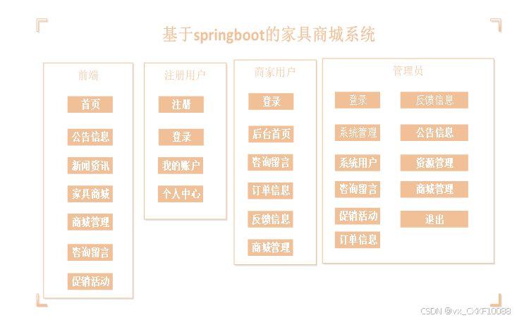 基于Spring Boot 的家具商城系统的设计与实现包含前端跟后端,其中还后端包含注册用户、商家和管理员三个角色划分,主要功能如下: