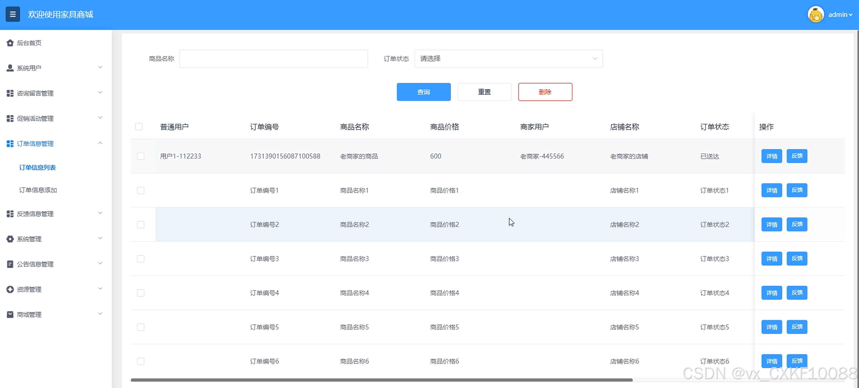 (6)订单信息管理:管理员监督所有订单的处理情况,并可进行查询、重置、删除等操作。