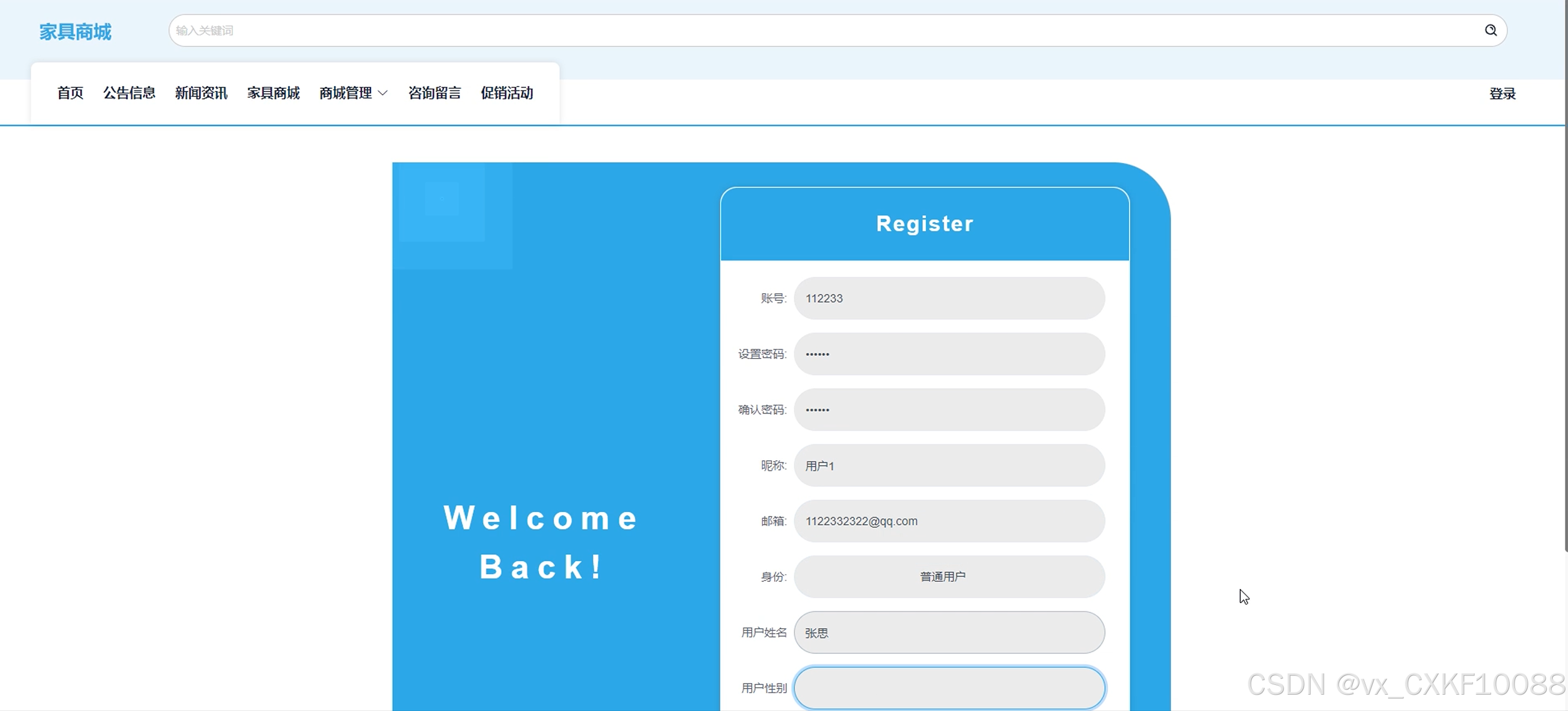 (1)用户注册:浏览用户注册:在用户注册页面中填写好账号、密码、确认密码、昵称、邮箱、选择身份、用户姓名、性别、手机号等字段值,点击下方注册按钮,提示注册成功后,系统将自动跳转回到首页。