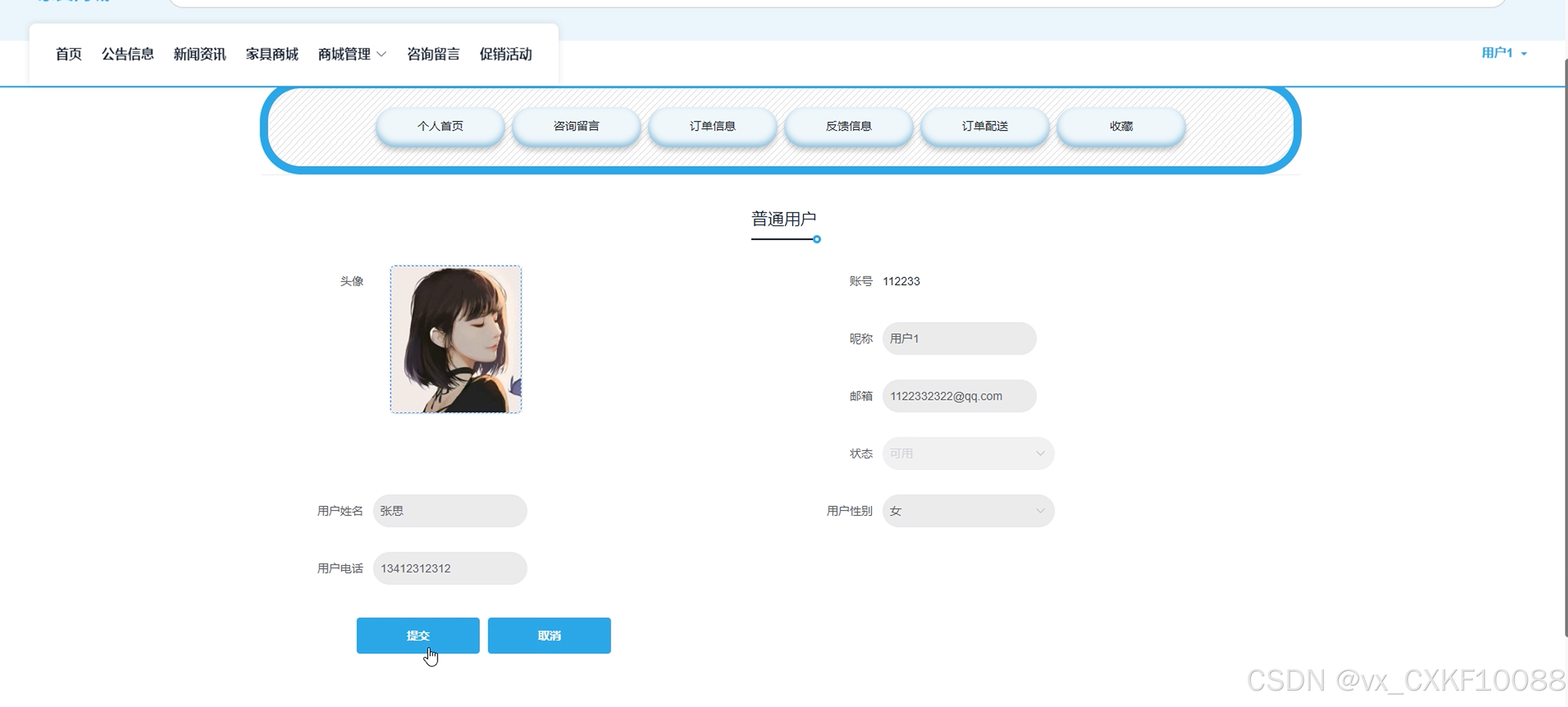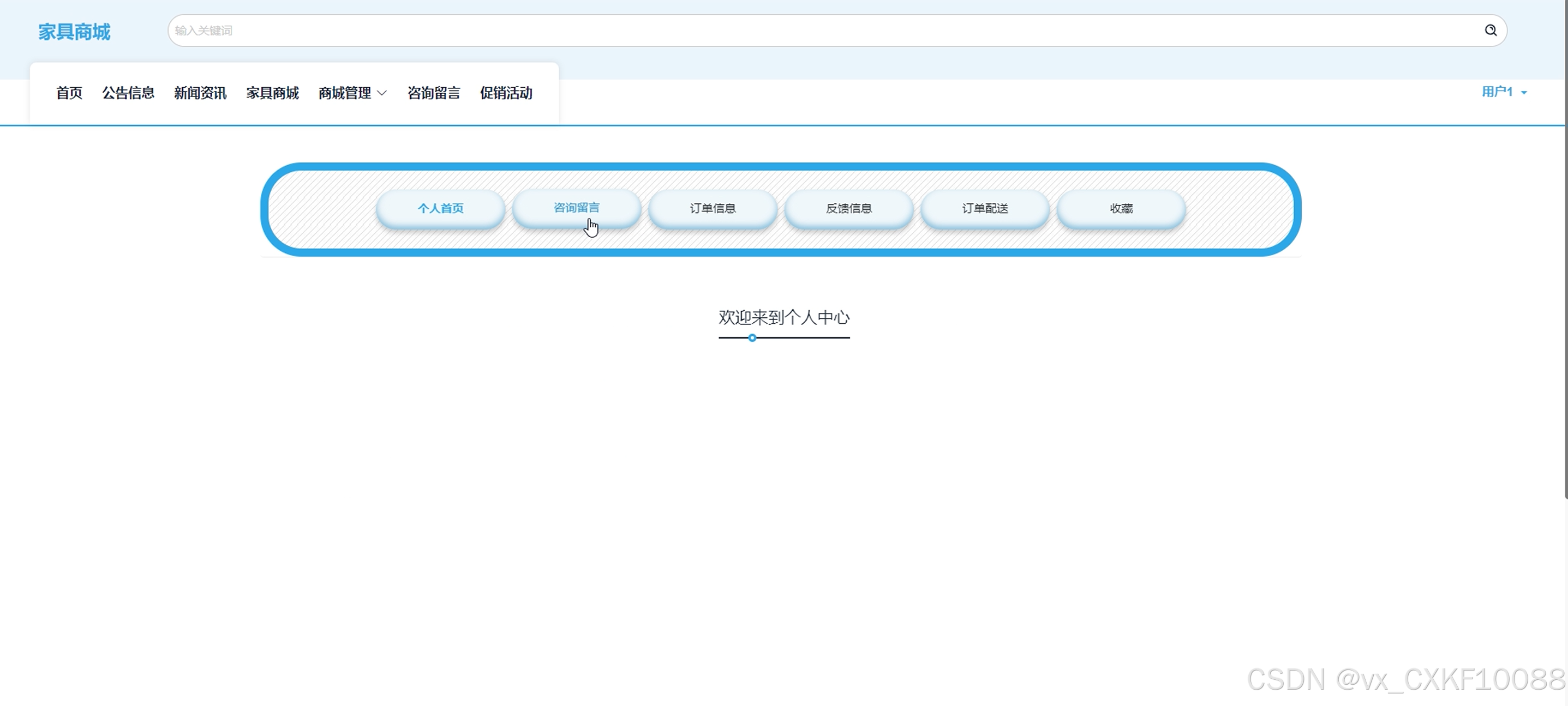 (4)个人中心:包含个人首页、咨询留言、订单信息、反馈信息、订单配送、收藏等。个人首页:展示用户的个人信息和快捷入口。咨询留言:用户可以向商家提出咨询或建议。订单信息:查看订单详情。反馈信息:提交使用过程中遇到的问题或建议。订单配送:跟踪订单的物流信息。收藏:保存感兴趣的家具商品。