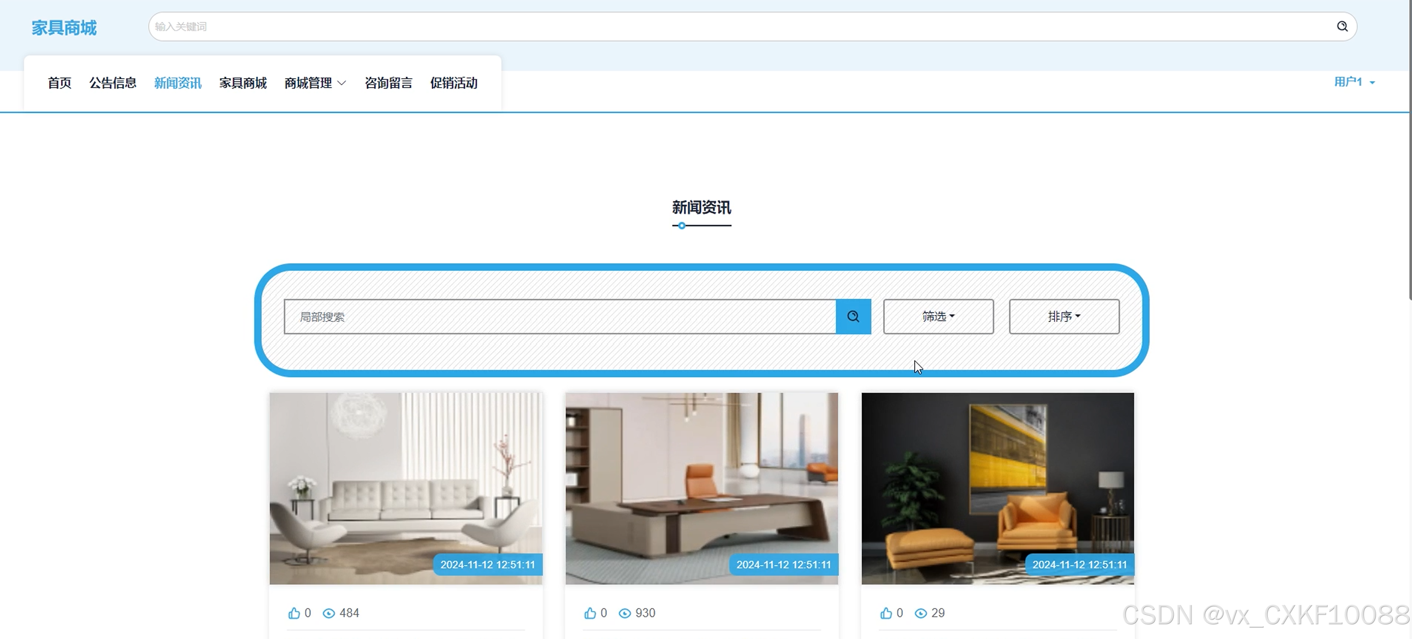 家具商城:展示所有后台发布的家具商城列表信息,点击可查看是家具详情信息。可进行商品购买、领取优惠券、点赞、收藏以及发表评论。家具商城列表如图5-4所示。