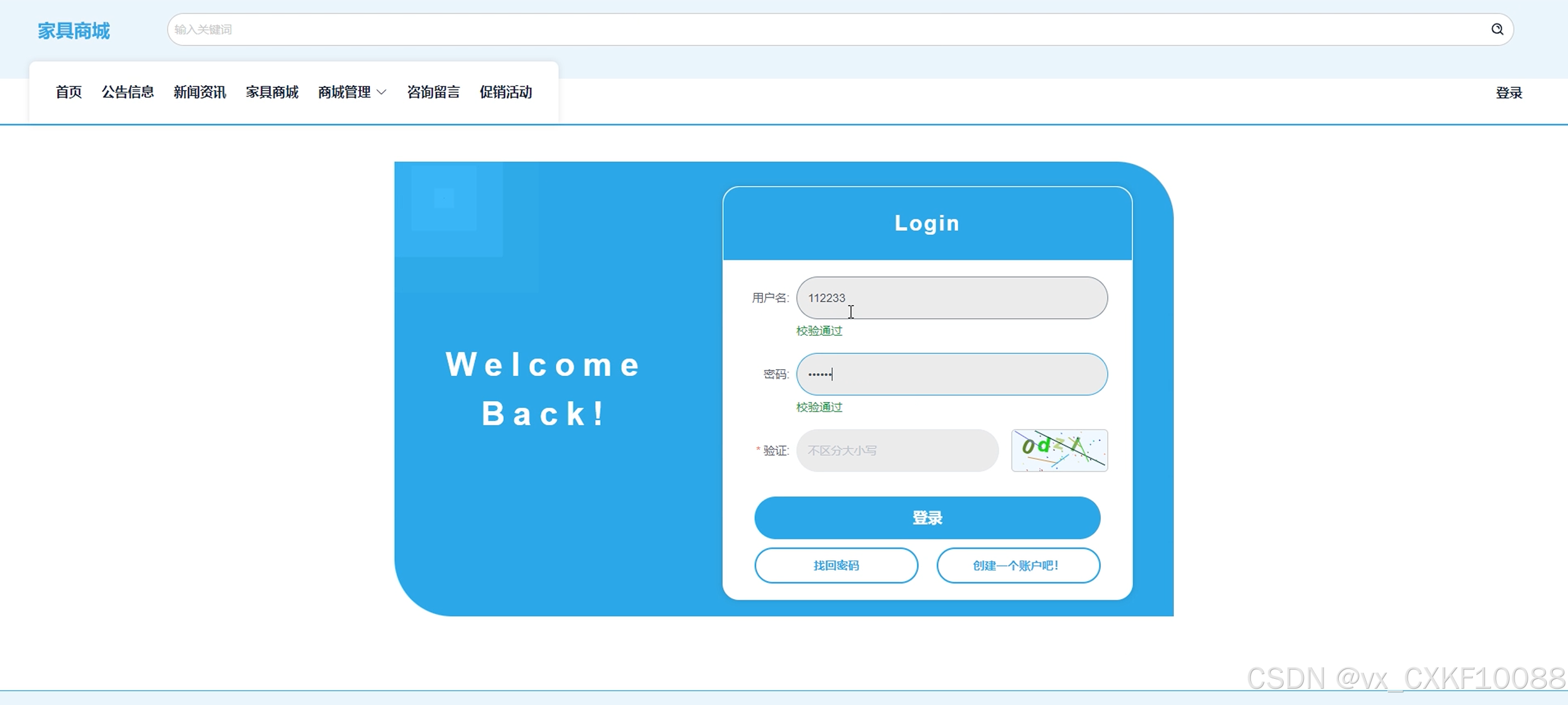 (2)用户登录:点击“登录”按钮,输入用户名以及密码登录系统,登录时前端会自动校验用户名与密码,输入正确登录成功,输入错误会有提示信息。
