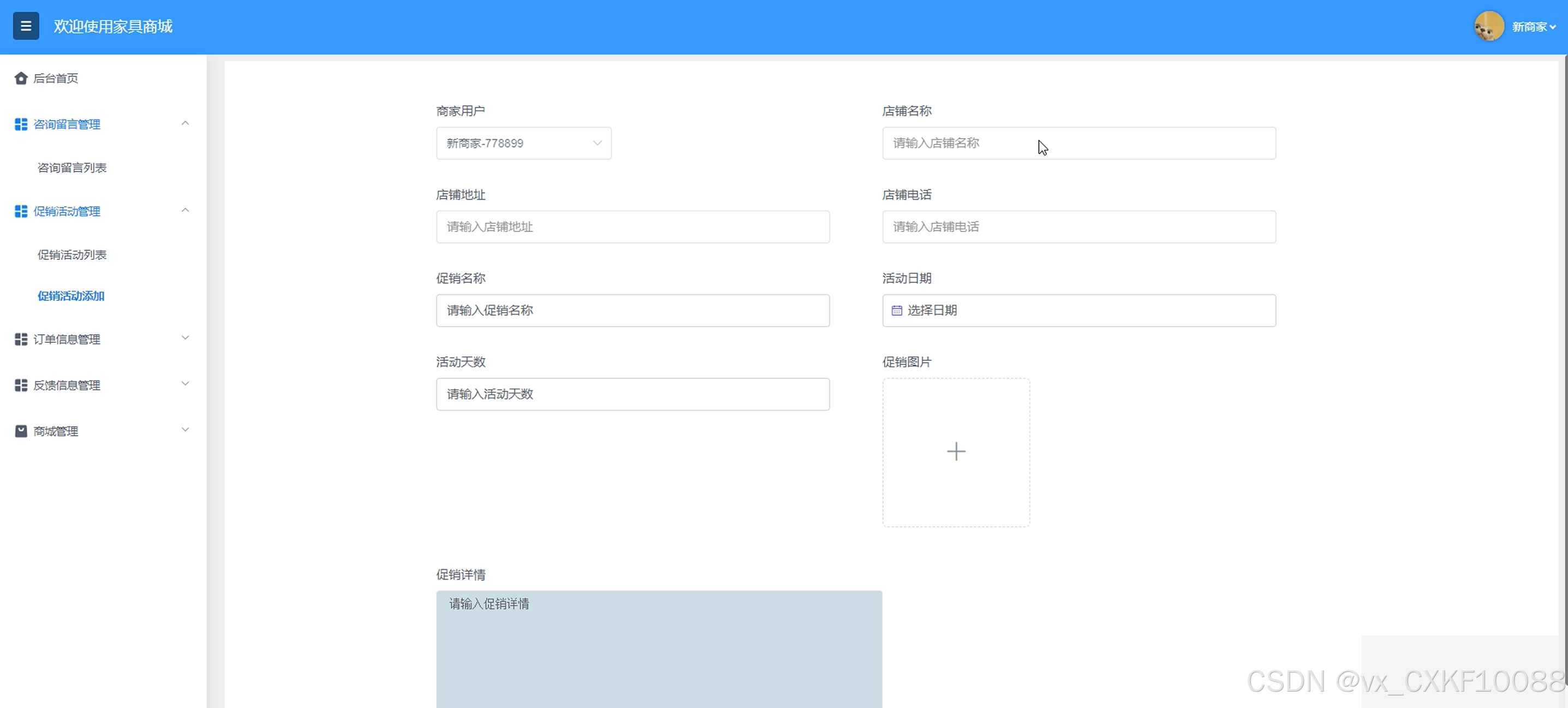 家具商城:商家用户管理商品信息,如上下架、库存调整、价格设置等,并进行增删改查等操作。家具商品添加如图5-10所示。