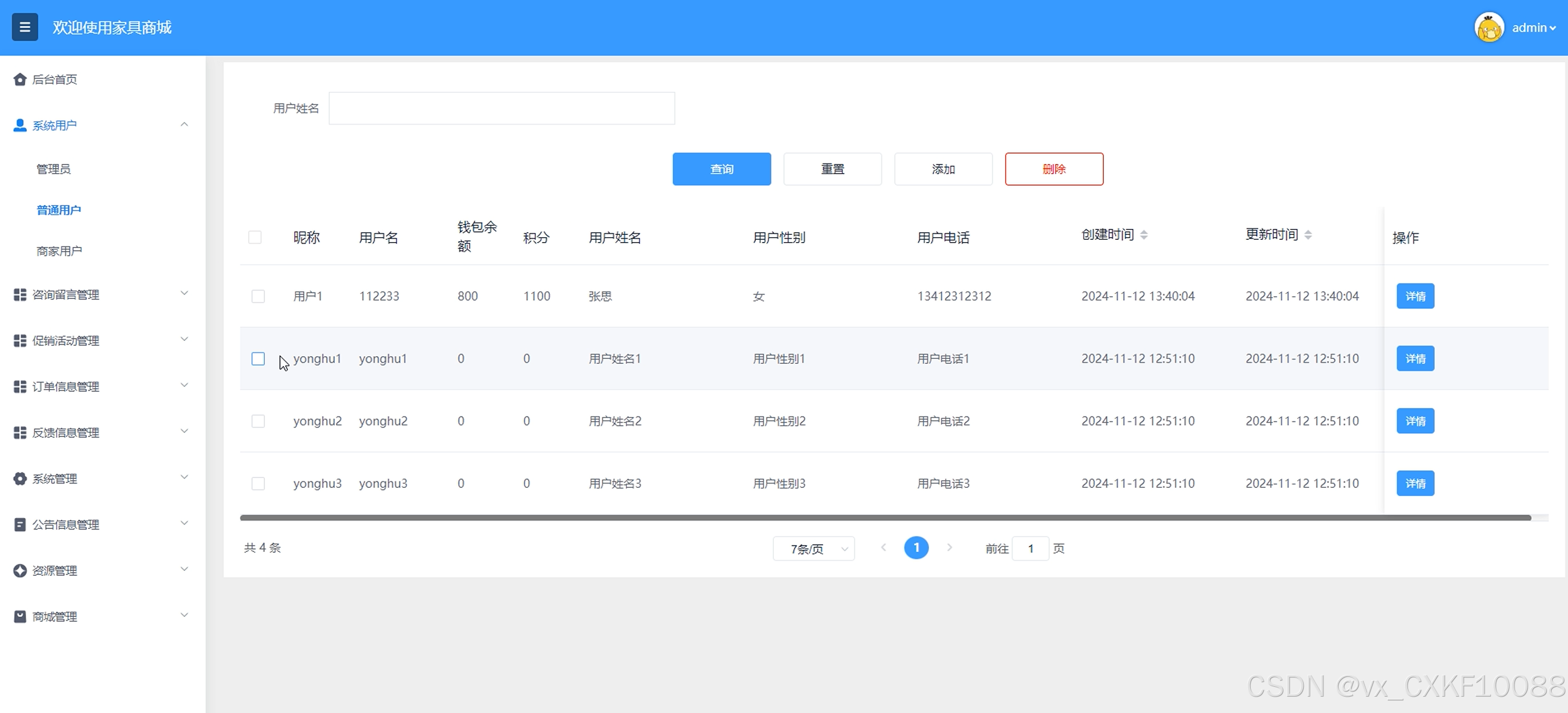 (2)系统用户:管理注册用户、商家用户和管理员信息,包含查询、新增、删除、查看详情等操作。