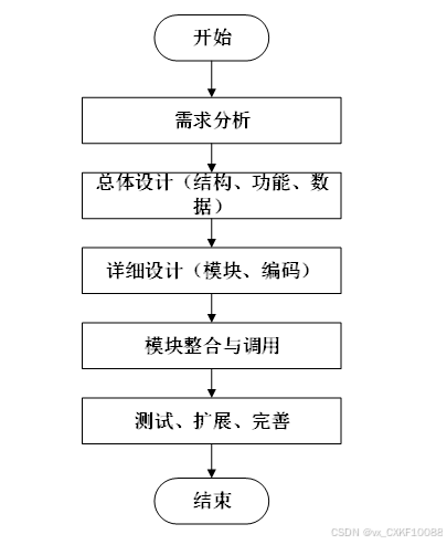 系统开发流程的主要步骤,从需求分析到系统完成的全过程。流程包括需求分析、总体设计(结构、功能、数据)、详细设计(模块、编码)、模块整合与调用,以及测试、扩展和完善,最终完成系统的开发。本系统的开发流程如图3-4所示