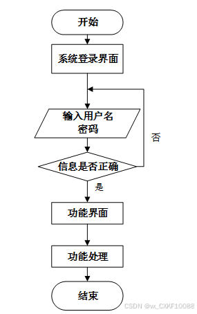用户首先进入系统登录界面,输入用户名和密码后,系统验证信息是否正确。若验证失败,返回登录界面重新输入;若验证成功,则进入功能界面,执行相应功能处理后结束操作流程。操作流程如图3-6所示。