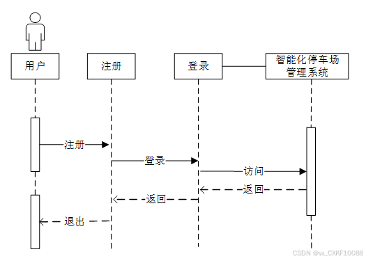 用户通过注册模块发送注册请求,系统完成注册后返回确认信息。随后,用户通过登录模块发送登录请求,系统验证用户信息后允许访问目标系统。用户完成操作后可选择退出,系统终止会话。注册时序图,如图4-3所示。