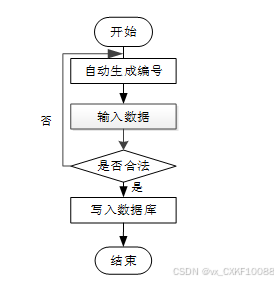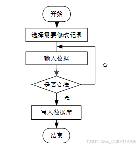 用户首先选择需要修改的记录,输入修改后的数据,系统判断输入数据是否合法。若数据不合法,提示重新输入;若数据合法,则将修改后的数据写入数据库,完成操作后流程结束。修改信息流程图如图3-8所示。