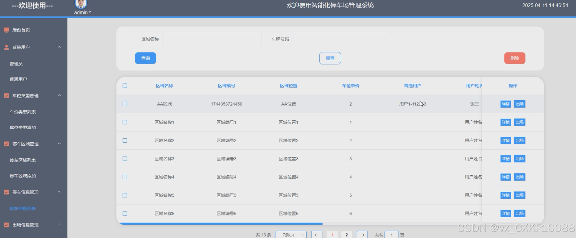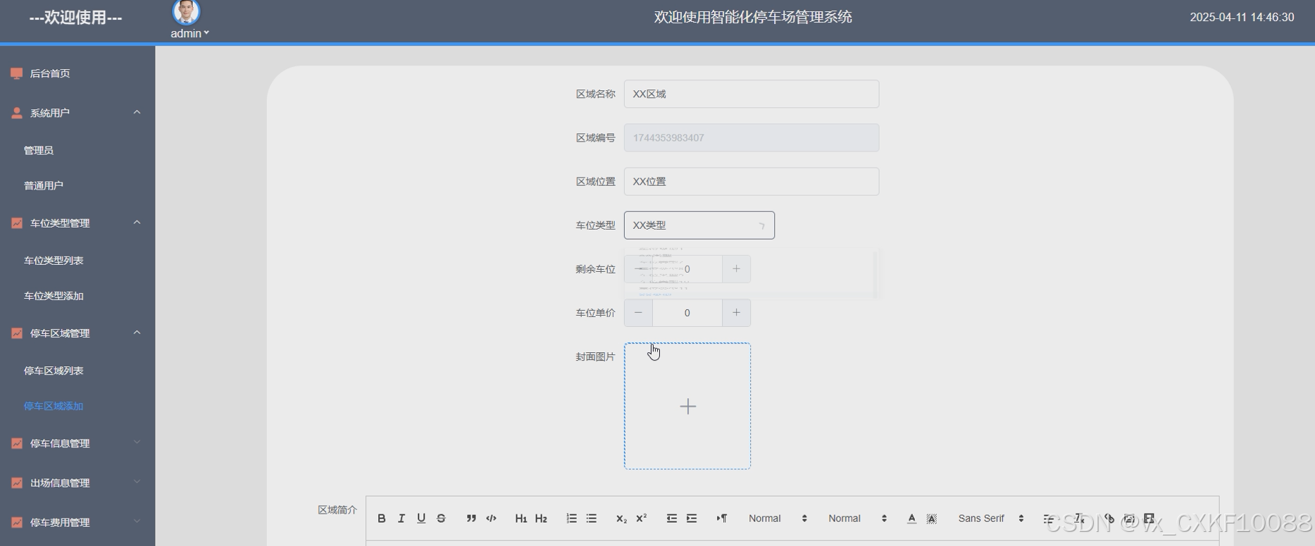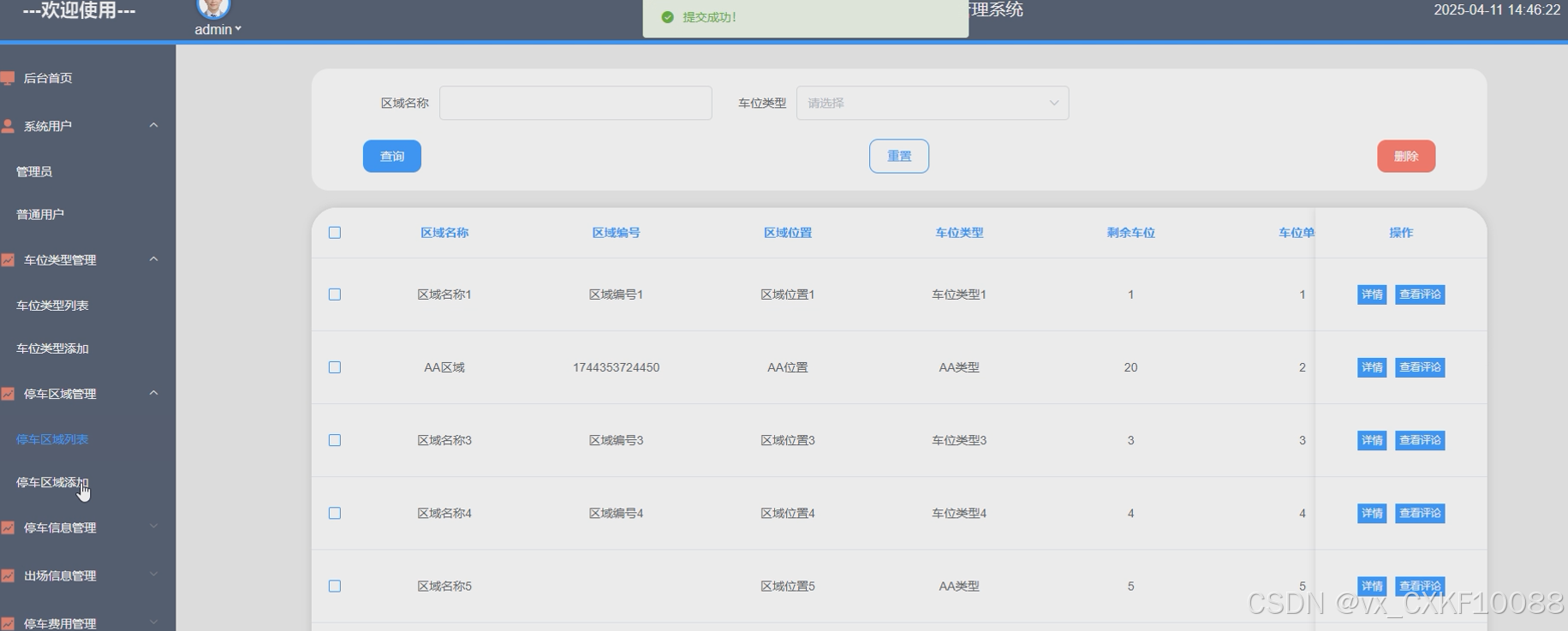 停车区域管理模块包含停车区域列表和停车区域添加功能。管理员可以查看停车场内所有的停车区域,并根据需求新增或调整停车区域布局,优化车位分配,提高停车场的使用效率。停车区域列表界面如图5-10所示、停车区域添加界面如图5-11所示。