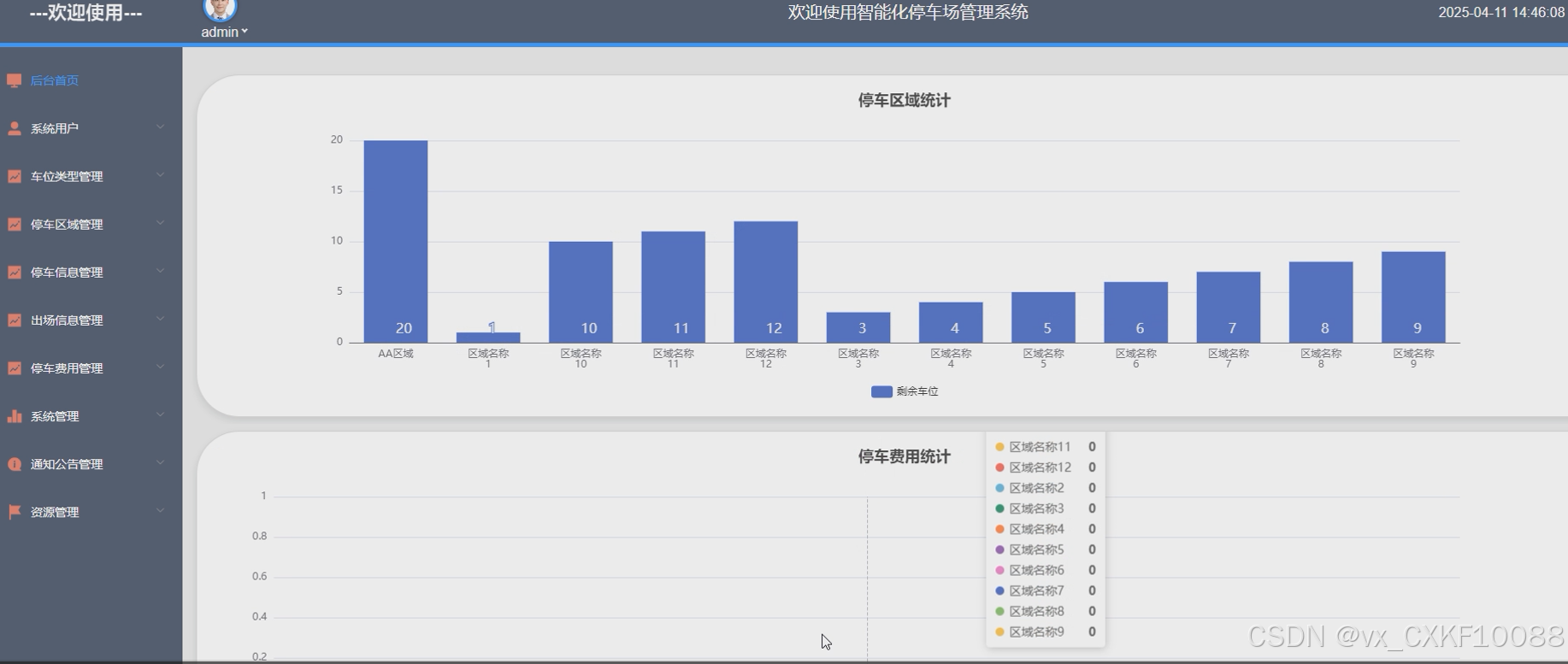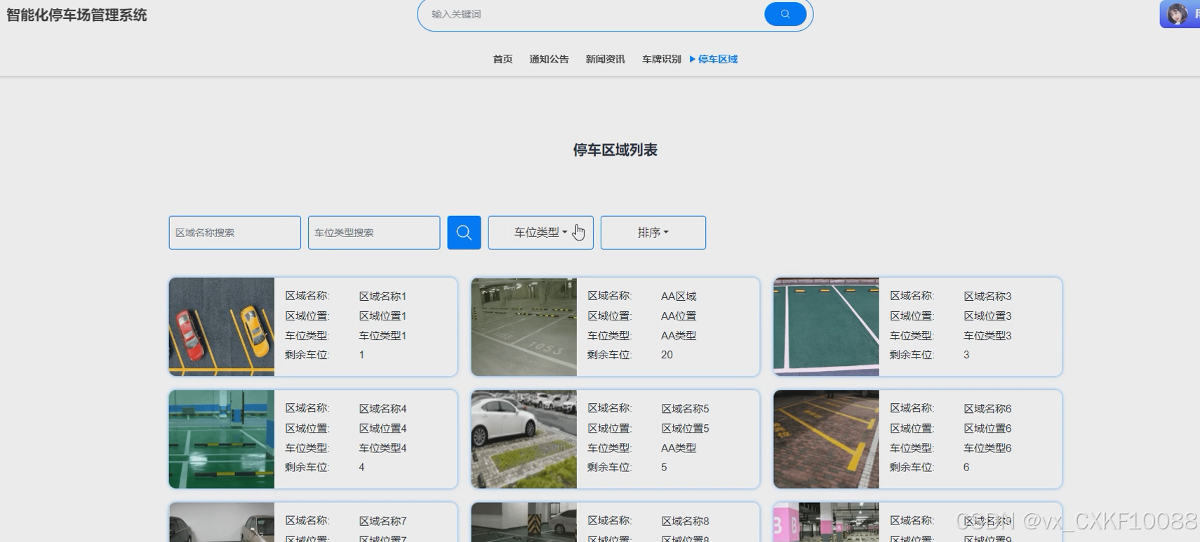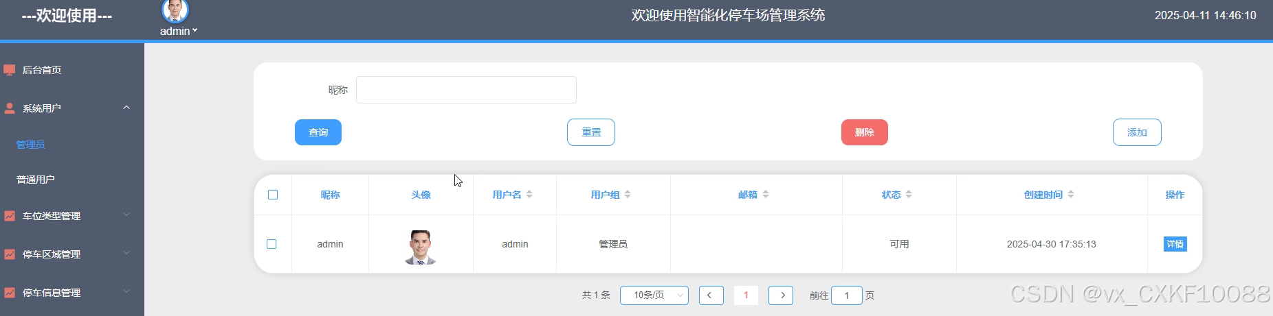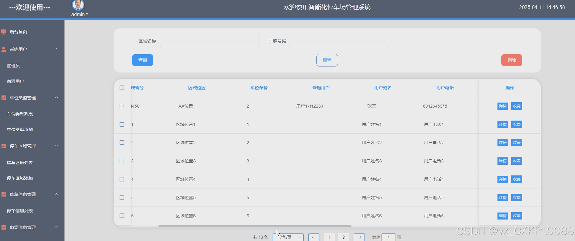 停车区域管理模块包含停车区域列表和停车区域添加功能。管理员可以查看停车场内所有的停车区域,并根据需求新增或调整停车区域布局,优化车位分配,提高停车场的使用效率。停车区域列表界面如图5-10所示、停车区域添加界面如图5-11所示。