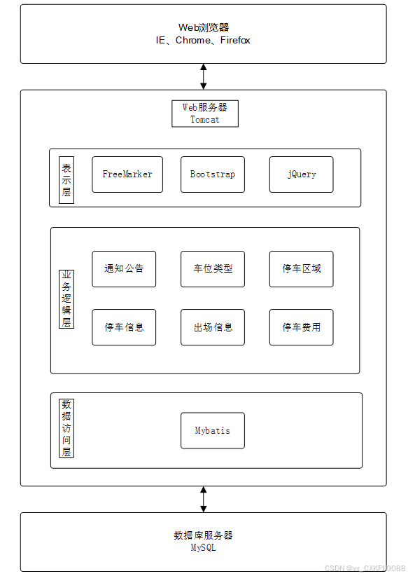 系统由表现层、业务逻辑层、数据访问层和数据库服务器组成。表现层通过浏览器(如IE、Chrome、Firefox)与用户交互,采用FreeMarker、Bootstrap、jQuery等技术实现界面呈现。业务逻辑层负责处理系统的核心业务逻辑,通过分模块设计实现功能分离。数据访问层使用MyBatis框架连接数据库,执行数据的增删改查操作。数据库服务器采用MySQL进行数据存储和管理,为系统提供稳定的数据库支持。整个架构通过Tomcat服务器完成用户请求的接收和处理,确保系统的高效运行[8]。整个系统架构如图4-1所示。