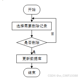 用户选择需要删除的记录后,系统判断是否确认删除。若未确认,返回选择环节;若确认删除,则更新数据库,删除对应记录,完成操作后流程结束。删除信息流程图如图3-9所示。