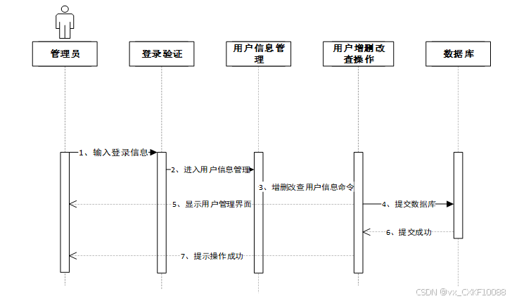 管理员输入登录信息后,进入用户信息管理模块,选择增删改查操作并提交命令至数据库。数据库执行操作后返回成功状态,系统显示用户管理界面并提示操作成功。管理员修改用户信息时序图如图4-5所示。
