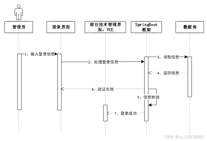 管理员输入登录信息后,登录界面将信息传递至前台管理界面,随后通过SpringBoot框架读取数据库中的用户信息并返回。系统验证信息,若验证成功则登录成功,若验证失败则返回错误提示。登录时序图如图4-4所示。