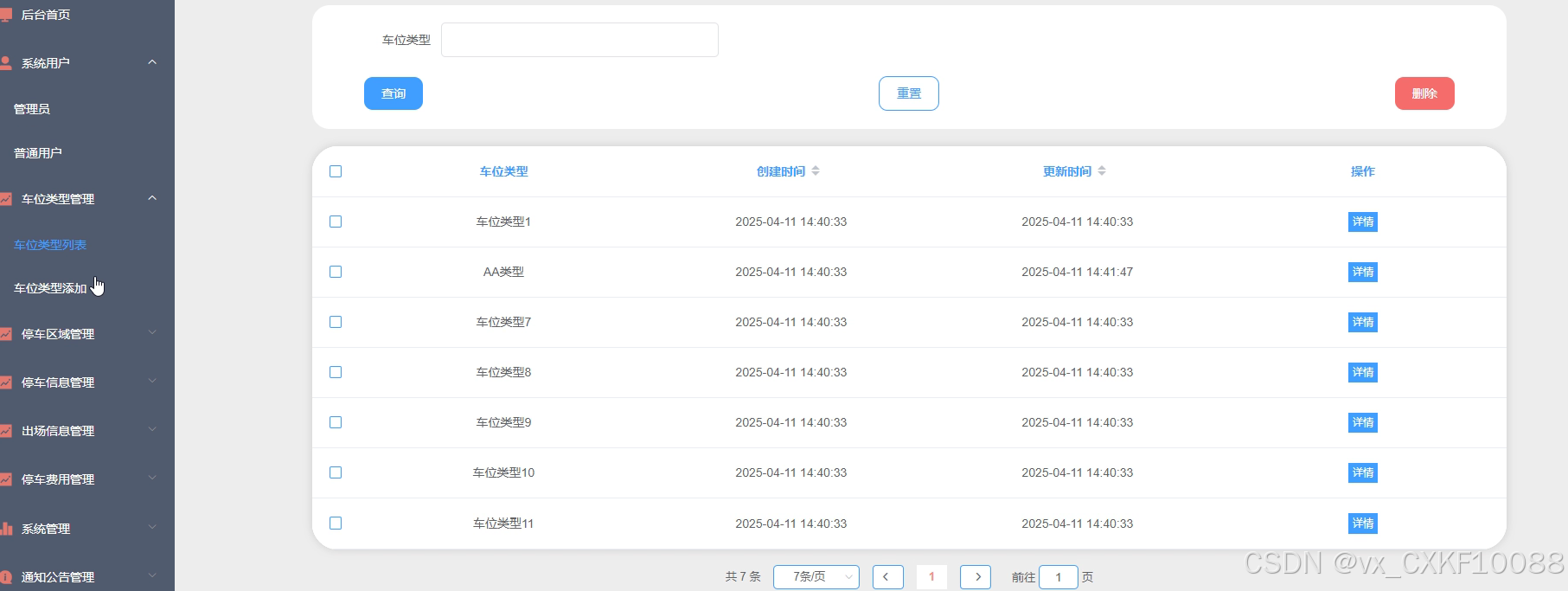 车位类型管理模块包括车位类型列表和车位类型添加功能。管理员可以查看所有车位类型,并根据需求新增或修改车位类型,灵活调整停车场的资源配置。车位类型管理界面如图5-9所示。