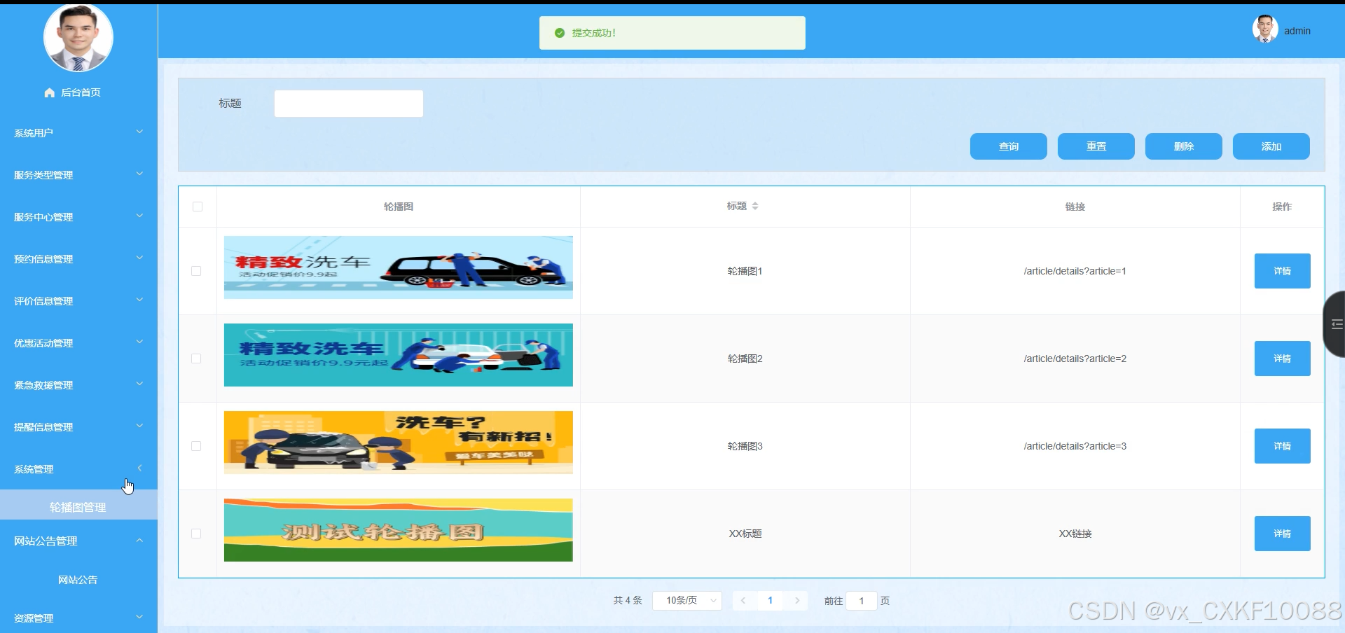 管理员可以对系统前台展示的轮播图增删改查,方便用户进行查看。轮播图界面如下图所示。