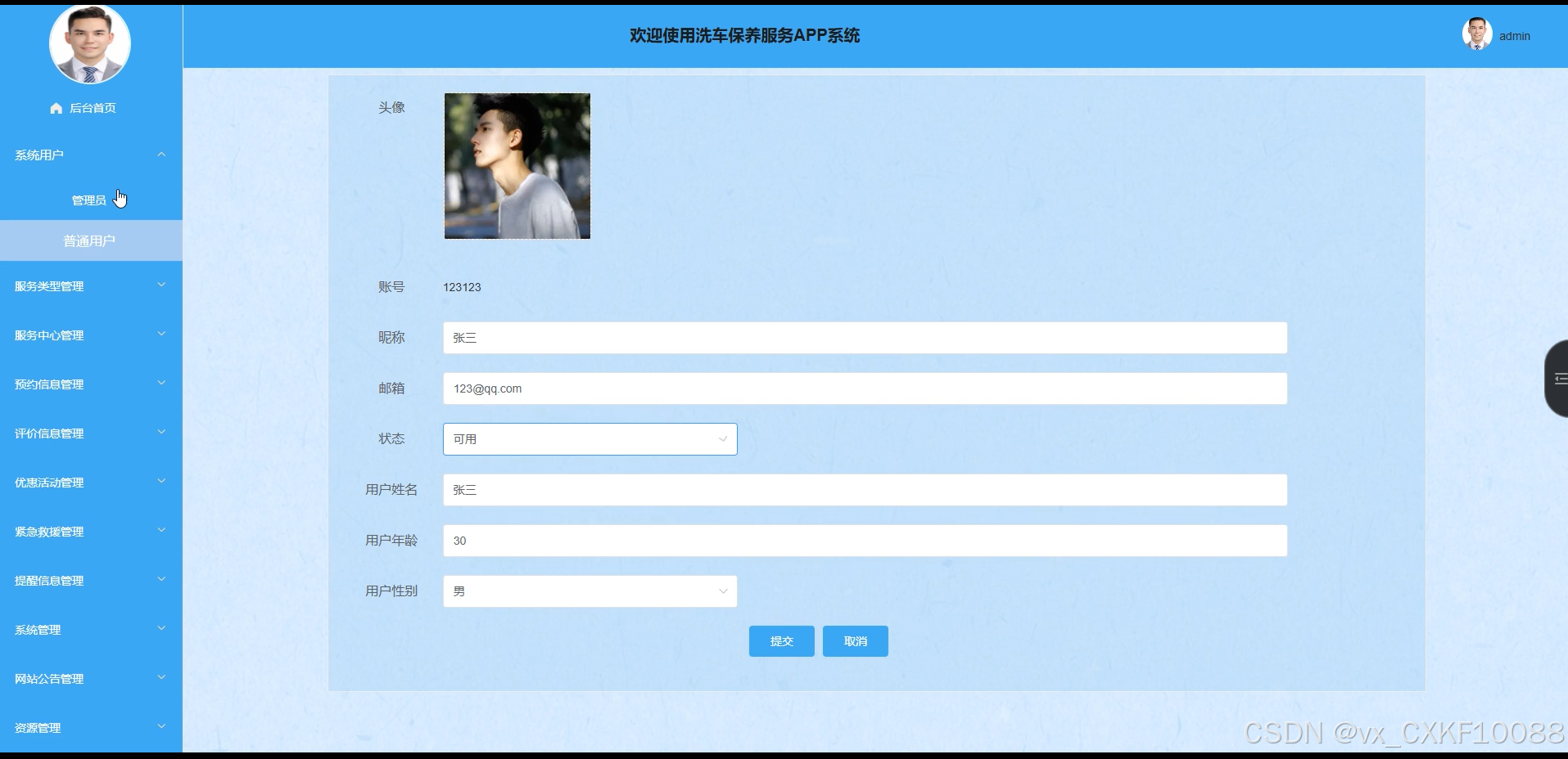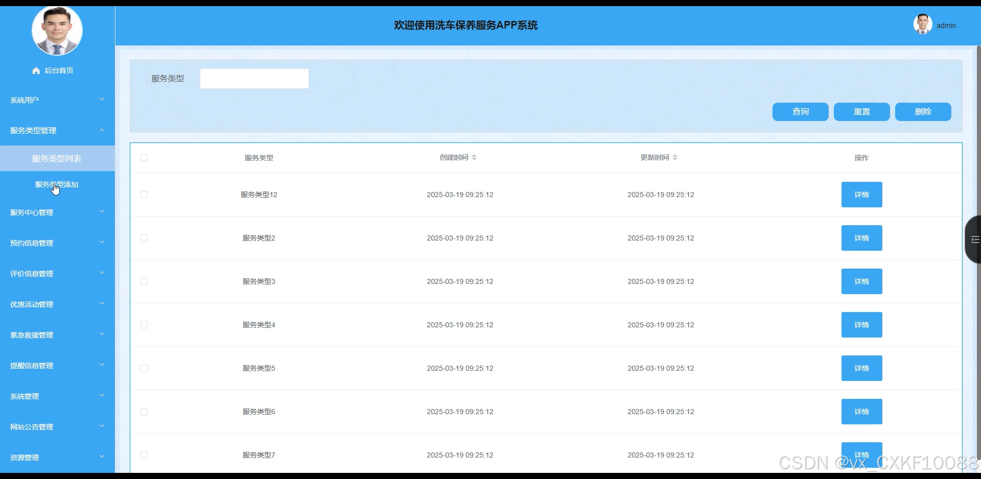 The SSM Car Wash and Maintenance Service APP system combines modern information technology with the needs of car wash and maintenance services, aiming to provide users with convenient and efficient car cleaning and maintenance services, while also providing comprehensive management and operational support for administrators. The system adopts SSM architecture as the technical framework, which has high scalability and stability. The system is divided into two main user groups - administrators and ordinary users, each with different functional modules.