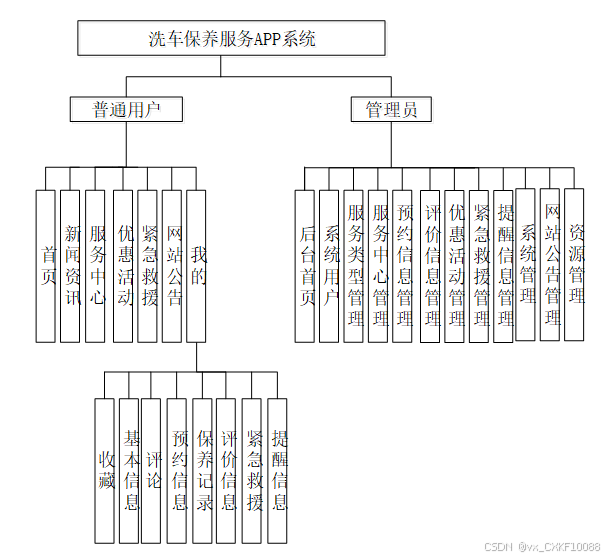 洗车保养服务APP系统划分为了普通用户模块和管理员模块这两大部分。