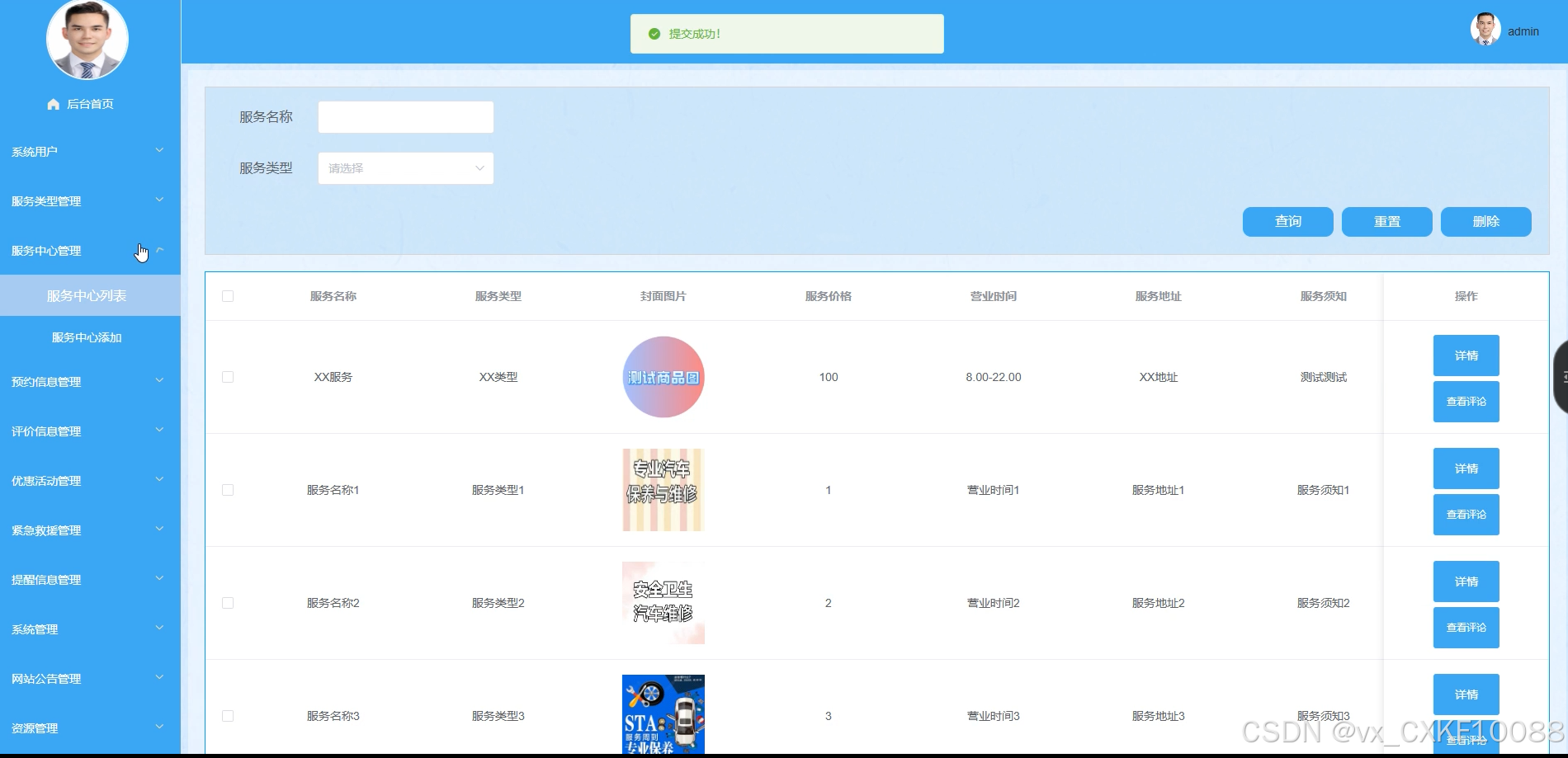 For administrators, the system provides powerful backend management functions, including user management, service type management, service center management, appointment information management, evaluation information management, discount activity management, etc. Administrators can comprehensively control various information during the service process and respond promptly to user needs. Functions such as emergency rescue management, reminder information management, carousel updates, and website announcement management help administrators efficiently organize and coordinate various services, ensuring the quality of user experience.
