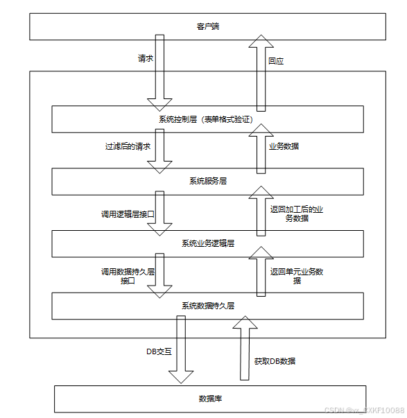 页面发送请求给控制器,控制器调用业务层处理逻辑,逻辑层向持久层发送请求,持久层与数据库交互,后将结果返回给业务层,业务层将处理逻辑发送给控制器,控制器再调用视图展现数据。