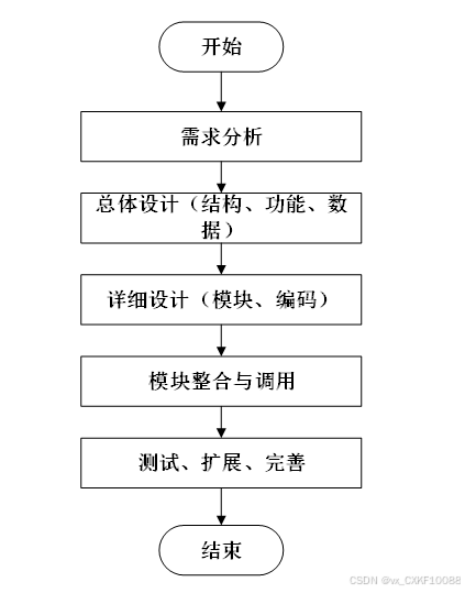 系统开发流程的主要步骤,从需求分析到系统完成的全过程。流程包括需求分析、总体设计(结构、功能、数据)、详细设计(模块、编码)、模块整合与调用,以及测试、扩展和完善,最终完成系统的开发。本系统的开发流程如图3-3所示