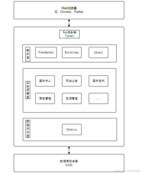 系统由表现层、业务逻辑层、数据访问层和数据库服务器组成。表现层通过浏览器(如IE、Chrome、Firefox)与用户交互,采用FreeMarker、Bootstrap、jQuery等技术实现界面呈现。业务逻辑层负责处理系统的核心业务逻辑,通过分模块设计实现功能分离。数据访问层使用MyBatis框架连接数据库,执行数据的增删改查操作。数据库服务器采用MySQL进行数据存储和管理,为系统提供稳定的数据库支持。整个架构通过Tomcat服务器完成用户请求的接收和处理,确保系统的高效运行[8]。整个系统架构如图4-1所示。