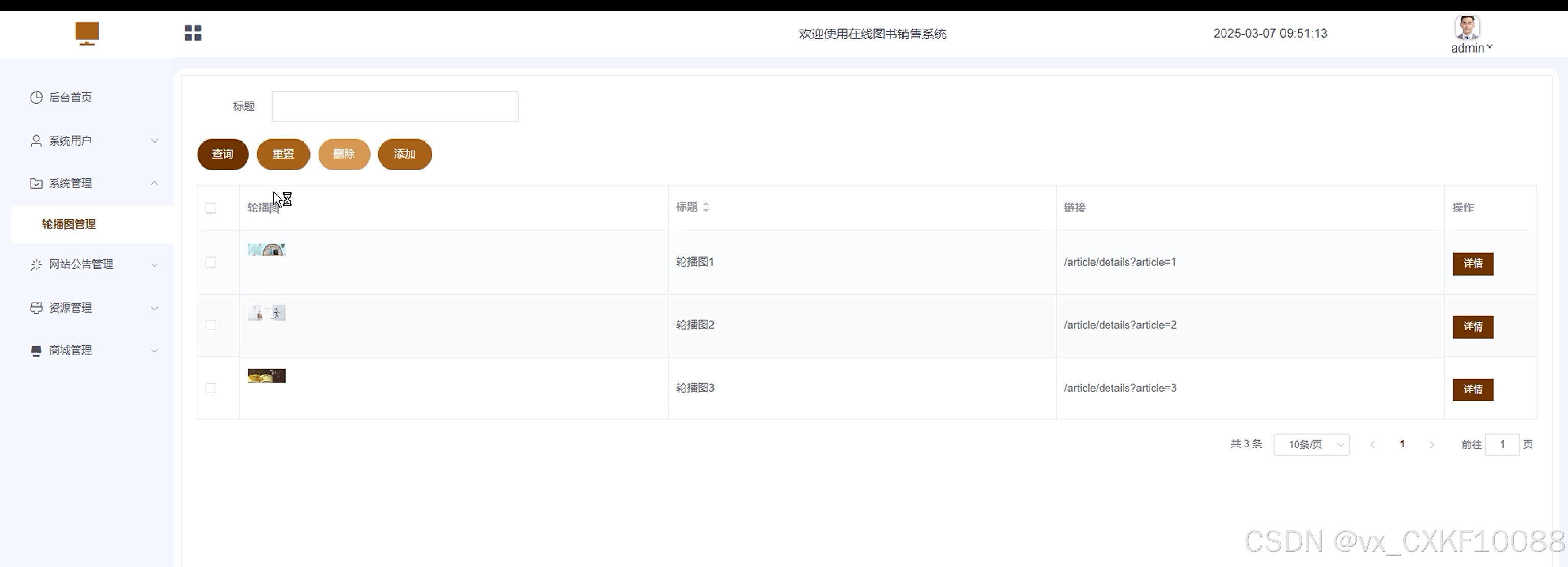 (4)系统管理:管理员点击可查看轮播图管理;如需添加新的轮播图,点击右侧“添加”按钮,上传图片,输入标题和链接,点击“确认”按钮进行添加,可对轮播图进行增删改查。