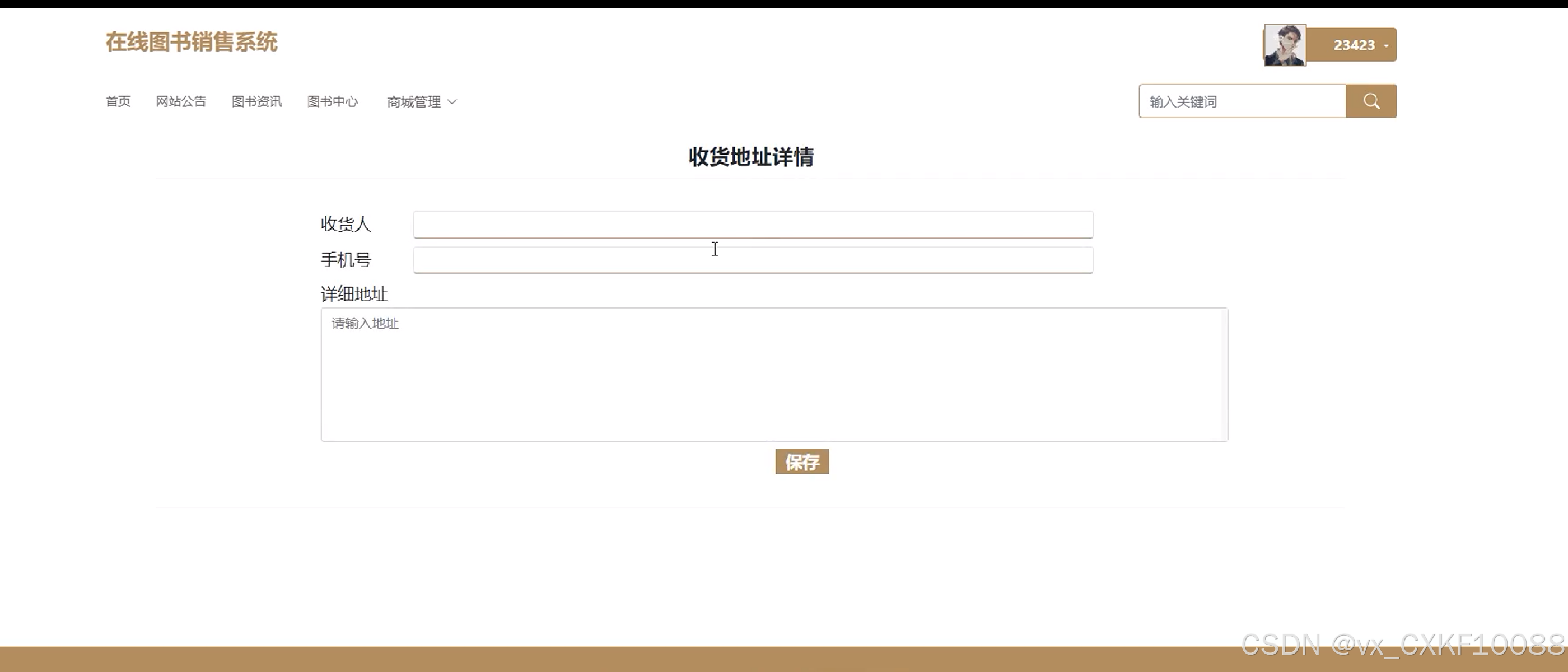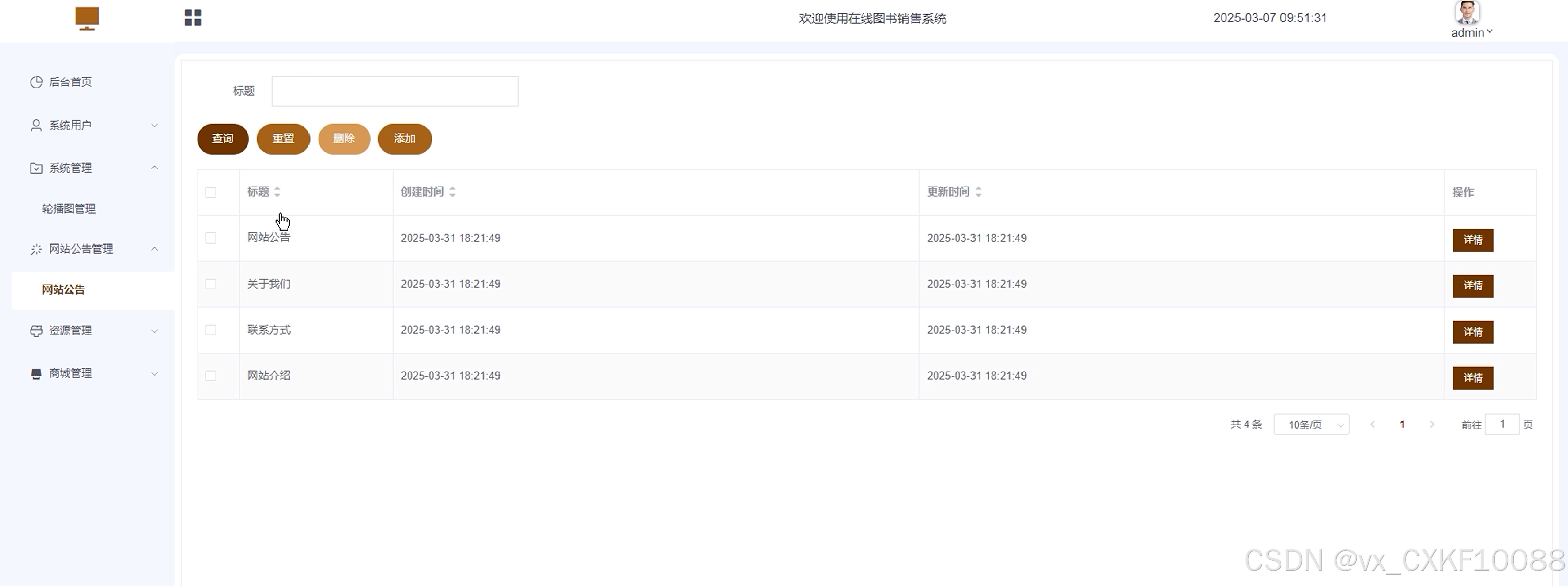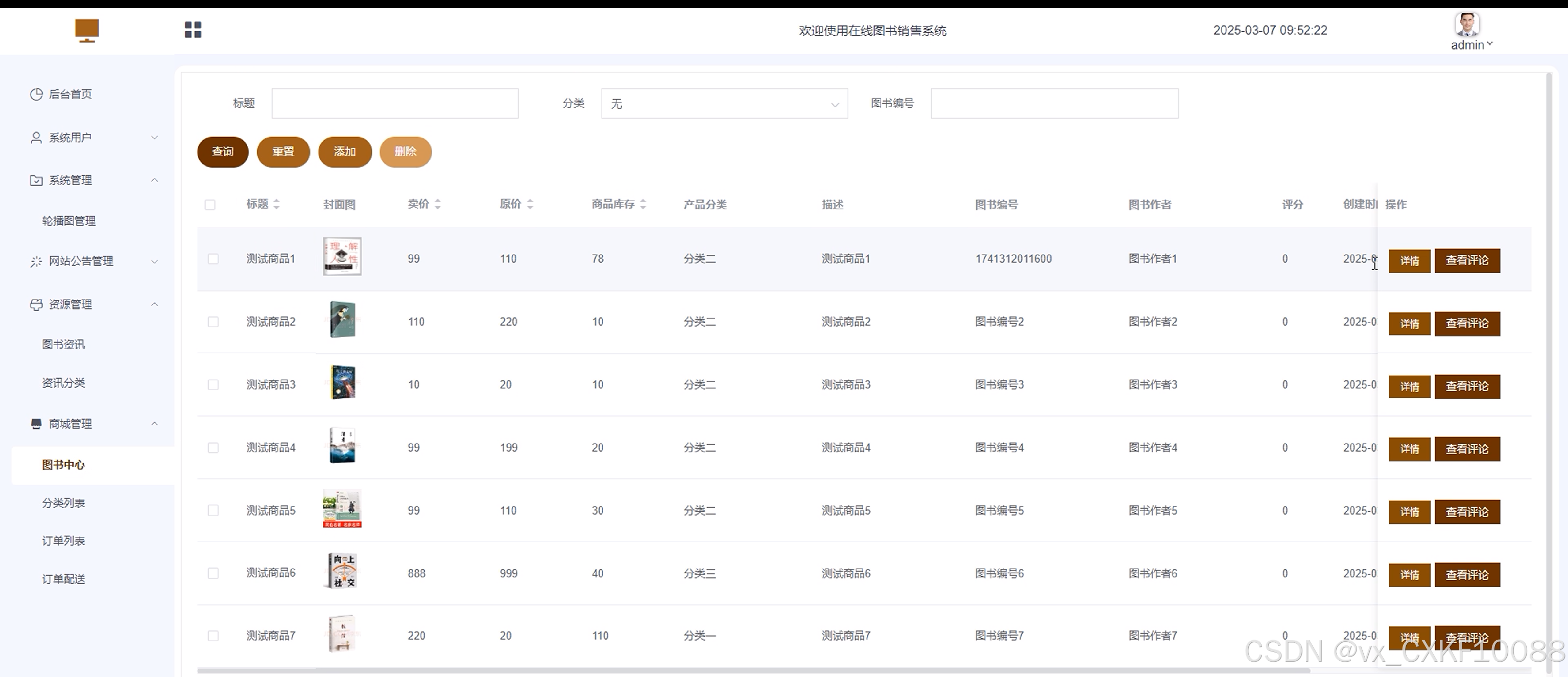 对于系统管理员而言,该系统提供了一套全面的后台管理解决方案,涵盖了从用户信息管理到商品和订单处理等多个方面。管理员可通过后台首页查看关键业务数据统计图,执行系统用户管理、轮播图及网站公告管理、资源管理以及商城管理等操作。特别地,在商城管理模块中,管理员能够添加新图书信息,管理图书分类列表,以及处理订单配送等事务,从而确保系统的正常运作和持续优化。此系统不仅提升了用户体验,同时也提高了图书销售管理的效率。