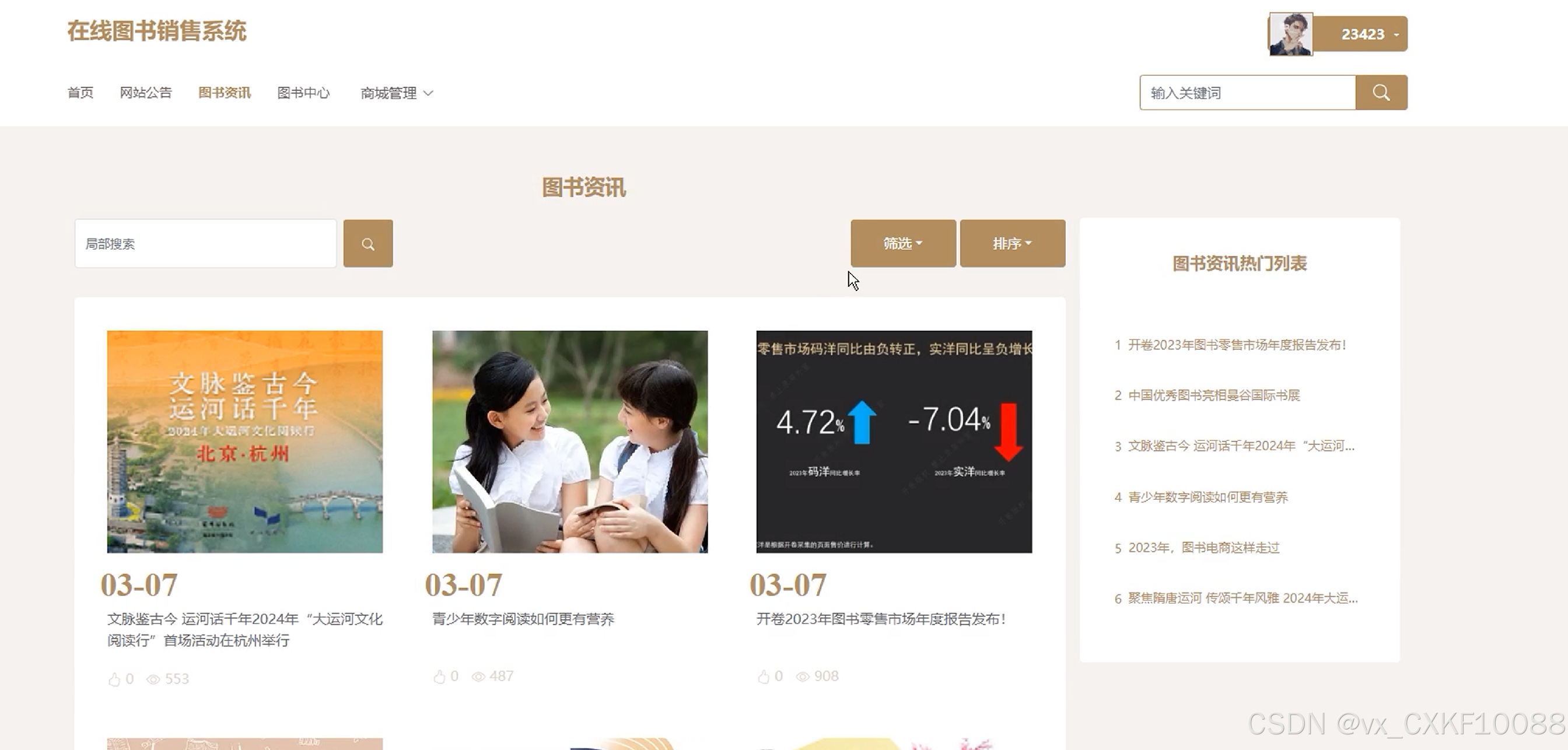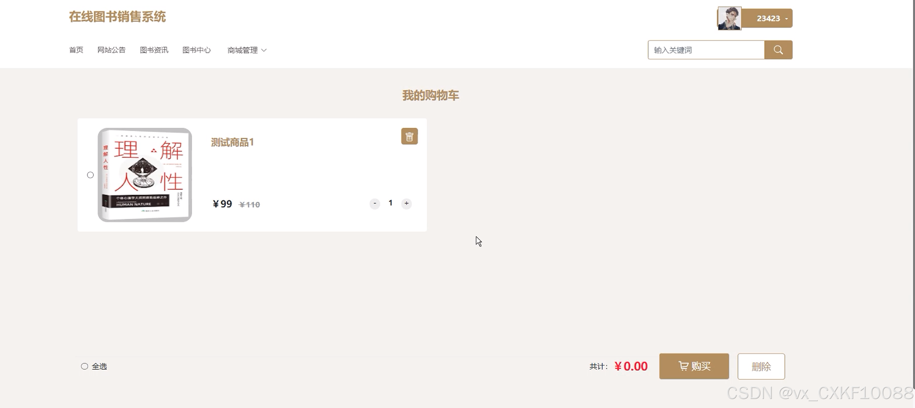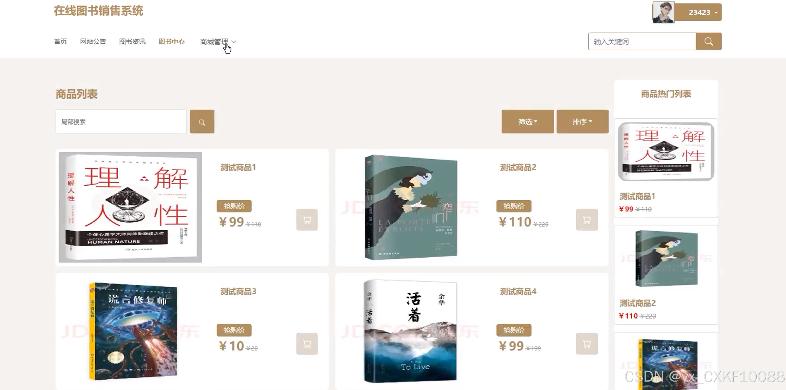 对于系统管理员而言,该系统提供了一套全面的后台管理解决方案,涵盖了从用户信息管理到商品和订单处理等多个方面。管理员可通过后台首页查看关键业务数据统计图,执行系统用户管理、轮播图及网站公告管理、资源管理以及商城管理等操作。特别地,在商城管理模块中,管理员能够添加新图书信息,管理图书分类列表,以及处理订单配送等事务,从而确保系统的正常运作和持续优化。此系统不仅提升了用户体验,同时也提高了图书销售管理的效率。