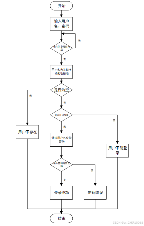 用户输入用户名和密码后,系统先检查输入是否为空,再验证用户名是否存在,若存在则通过用户名获取密码并校验。若密码正确则登录成功,否则提示密码错误。若用户名不存在或无法登录,提示用户操作无效。如图3-4所示。