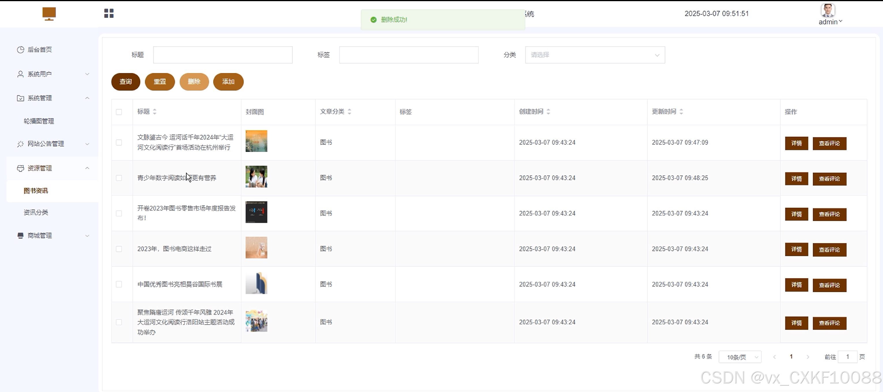 For system administrators, the system provides a comprehensive back-office management solution, covering many aspects from user information management to merchandise and order processing. Administrators can view statistical charts of key service data on the home page of the background, and perform operations such as system user management, management of roasts, website announcements, resource management, and mall management. In particular, in the mall management module, the administrator can add new book information, manage the book classification list, and handle the order distribution and other matters, so as to ensure the normal operation and continuous optimization of the system. This system not only improves the user experience, but also improves the efficiency of book sales management.
