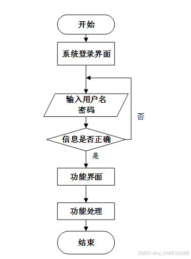 用户首先进入系统登录界面,输入用户名和密码后,系统验证信息是否正确。若验证失败,返回登录界面重新输入;若验证成功,则进入功能界面,执行相应功能处理后结束操作流程。操作流程如图3-5所示。