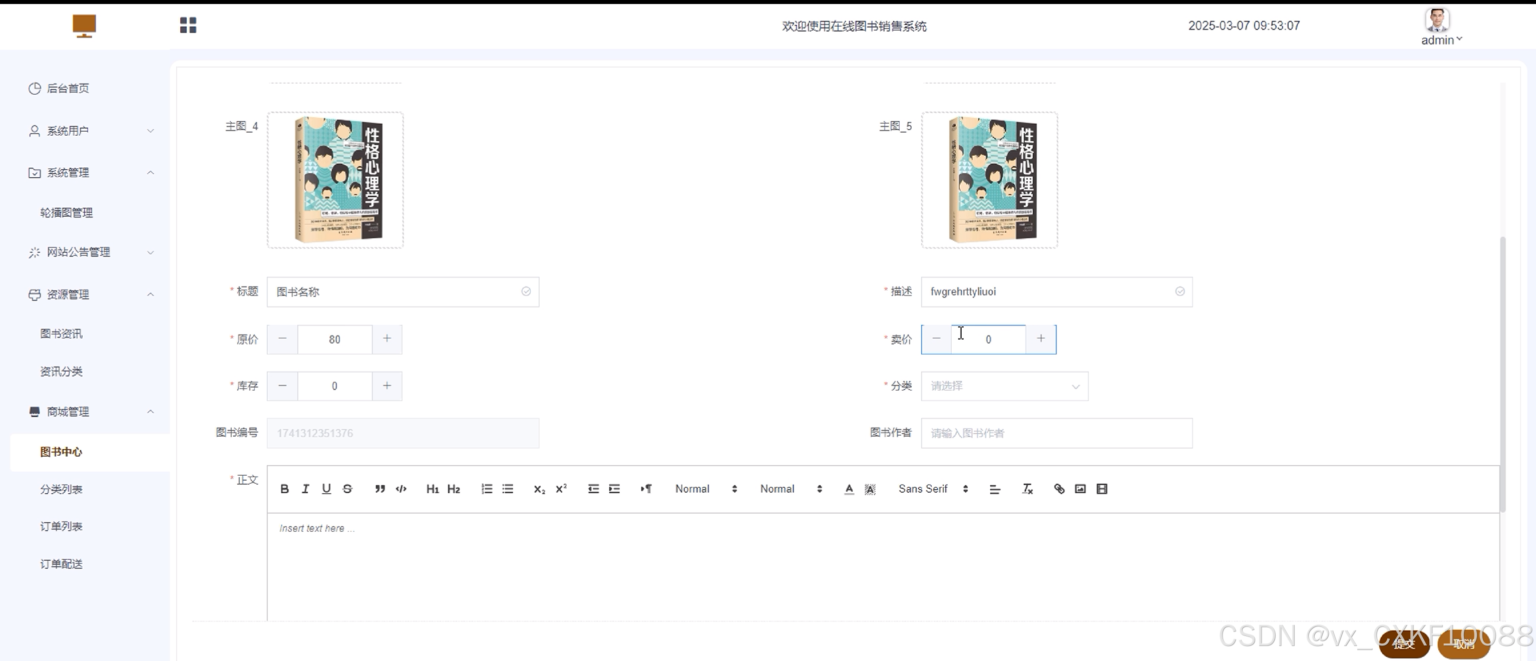 商城管理:商城管理包含多个功能模块,如图书中心、分类列表、订单列表、订单配送。点击进入“订单列表”可查看用户下单信息,同时点击“配送”按钮进行商品配送;点击进入“订单配送”可对配送状态和签收状态进行修改。点击进入”图书中心“可添加新的图书信息,包括封面图、主图、标题、描述、原价、卖价、库存、分类、图书编号、图书作者和正文。界面如下图所示。