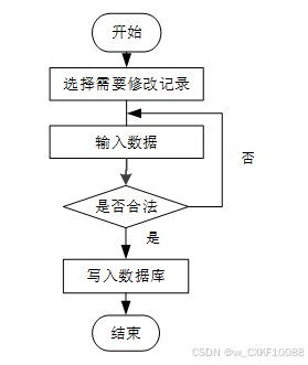 用户首先选择需要修改的记录,输入修改后的数据,系统判断输入数据是否合法。若数据不合法,提示重新输入;若数据合法,则将修改后的数据写入数据库,完成操作后流程结束。修改信息流程图如图3-7所示。