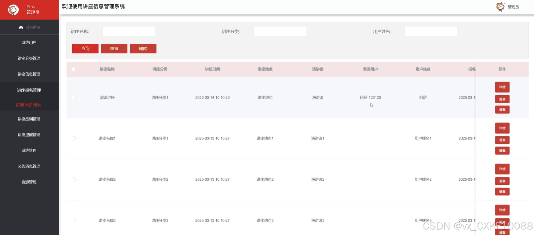 (4)讲座报名管理:管理员可查看所有用户讲座报名信息。并对用户进行一个提醒。可进行查询、重置、删除等操。