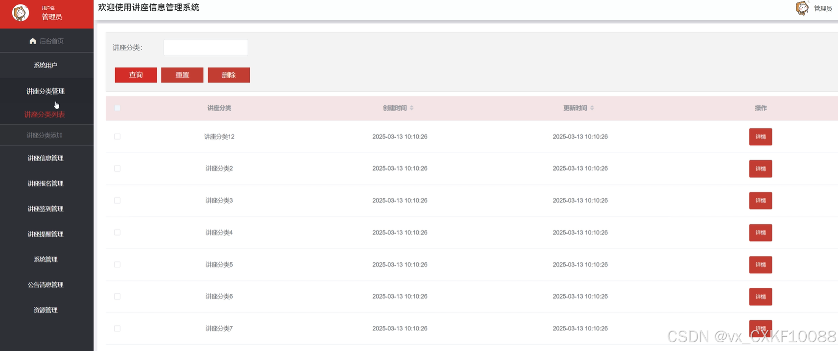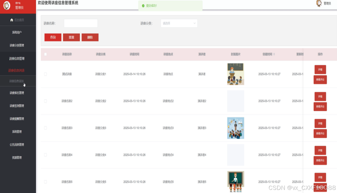 (3)讲座信息管理:包含讲座信息列表和讲座信息添加功能。讲座信息列表:展示所有管理员添加的讲座信息列表,可进行查询、重置、删除、点击详情等操作。讲座信息添加:可手动添加讲座信息。添加的信息可在前台首页展示。