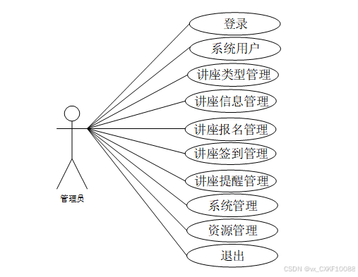 springboot讲座信息管理系统中管理员涉及后台首页、系统用户、讲座类型管理、讲座信息管理、讲座报名管理、讲座签到管理、讲座提醒管理、系统管理、资源管理等,管理员对应的用例图如图3.2所示: